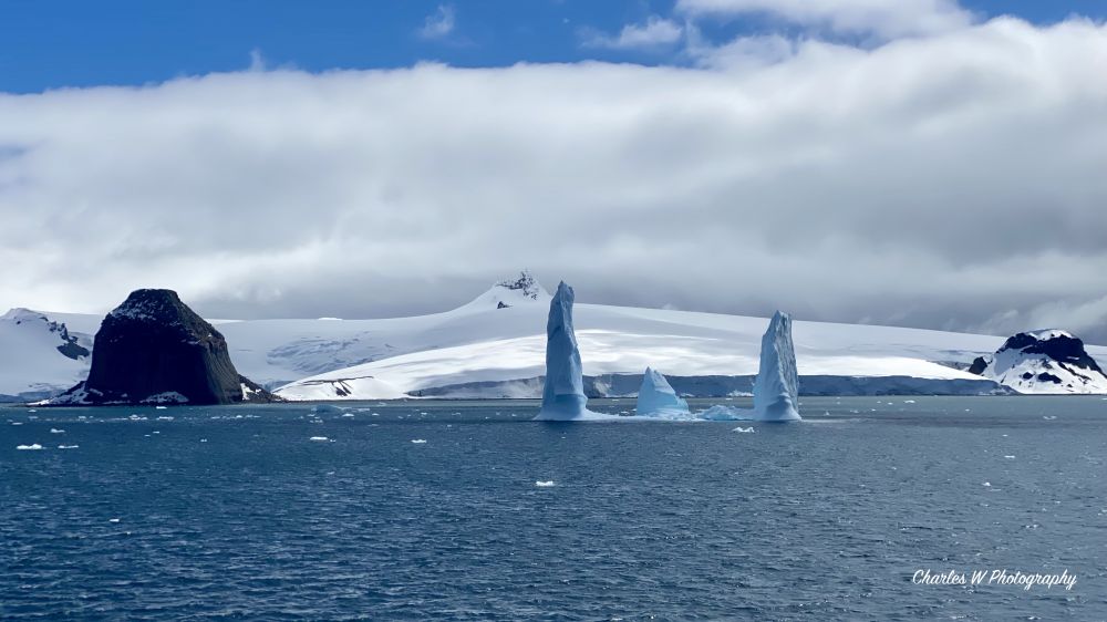 由于其独特的外观,爱丁堡山是南极游轮航线(尤其是经过利文斯顿岛和半月岛时)的热门摄影点, 我们游轮也就成为其中之一了。虽然我们不能直接登顶,但近距离环绕航行足以观察到宏伟的玄武岩纹理。在蔚蓝的海洋,白云飘飘的蓝天,蓝白的冰山中,这座黑黑的小山自然地在摄影人眼里出彩了。