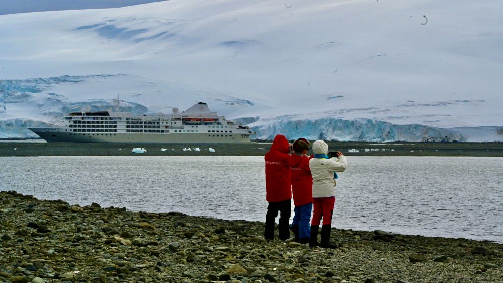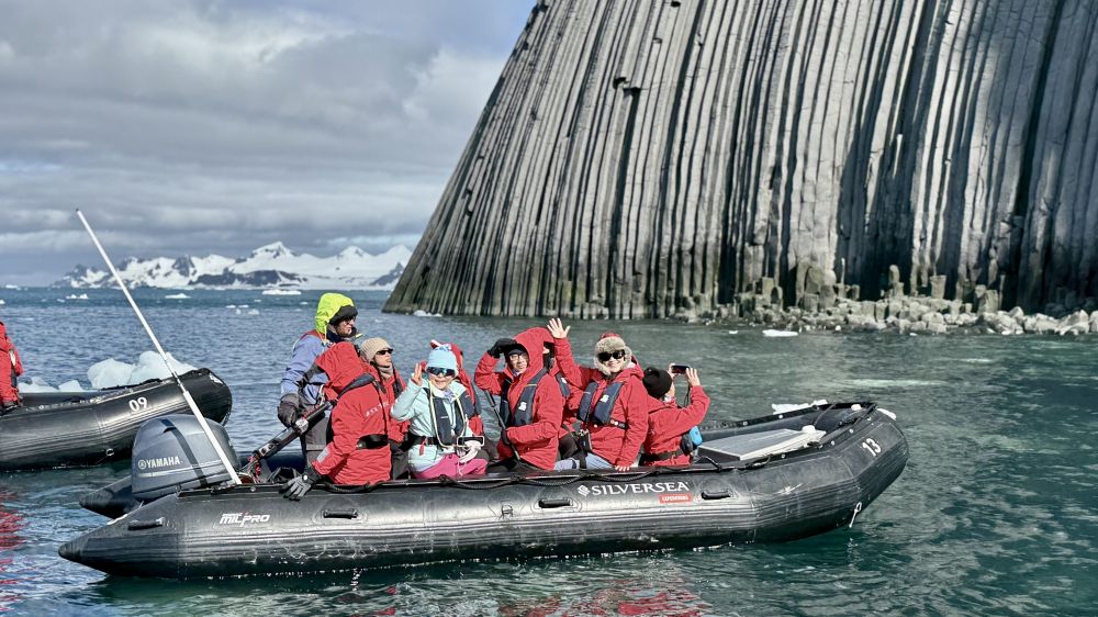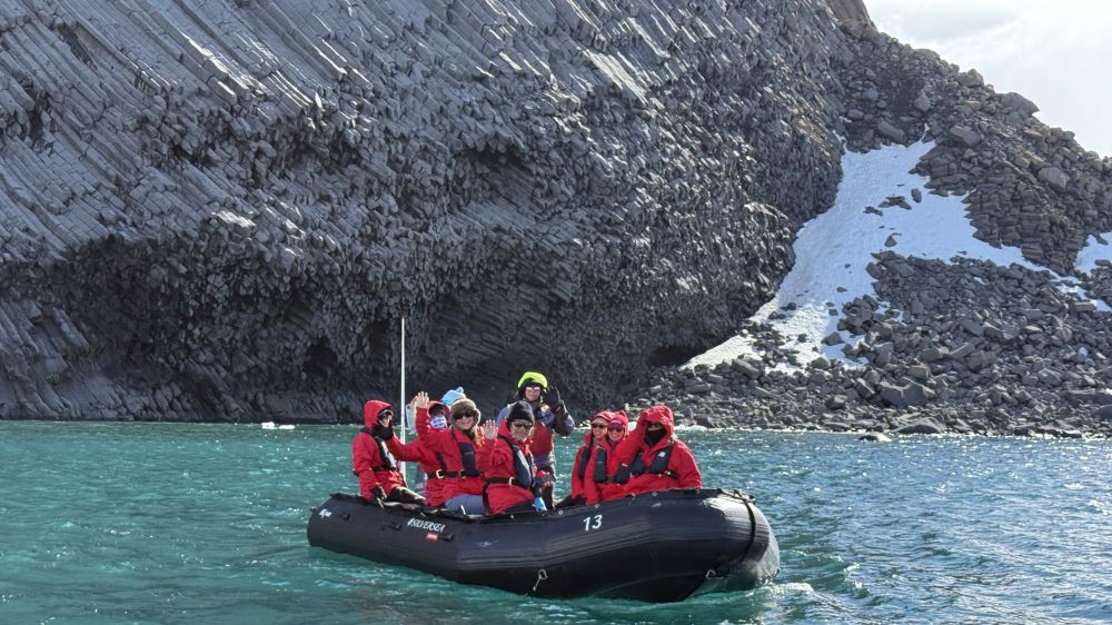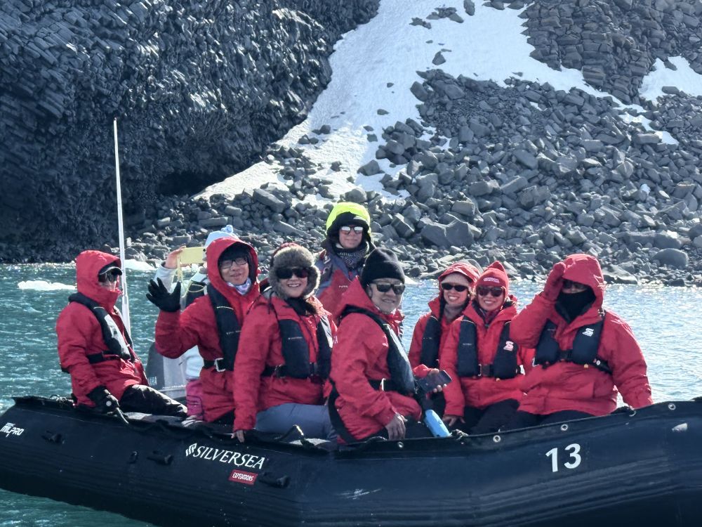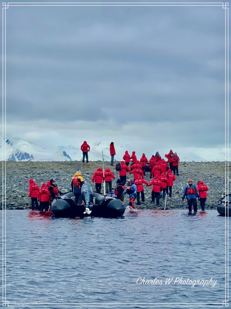 我们分组出游,船上会通知哪一组准备下到三楼。轮到我们了,立即下去换上登陆靴。排队上冲锋舟,目标是洋基港(Yankee Harbour)。从地理上洋基港在南设得兰群岛的格林威治岛(Greenwich Island)西南角。Yankee Harbour是南极半岛航线上的热门登陆点之一,是一座被冰川环绕的天然小港湾,入口狭窄,内部却异常平静,几乎像一个天然避风港。