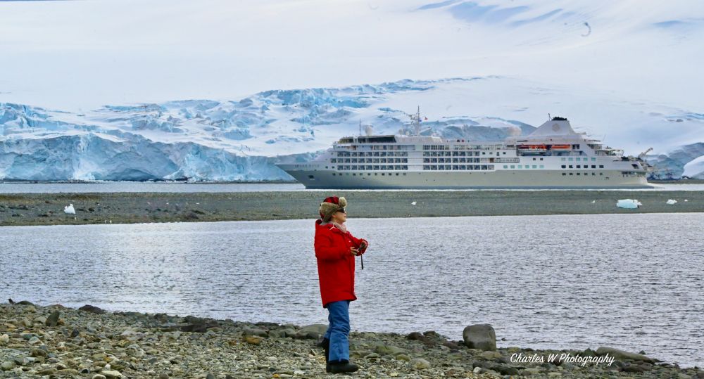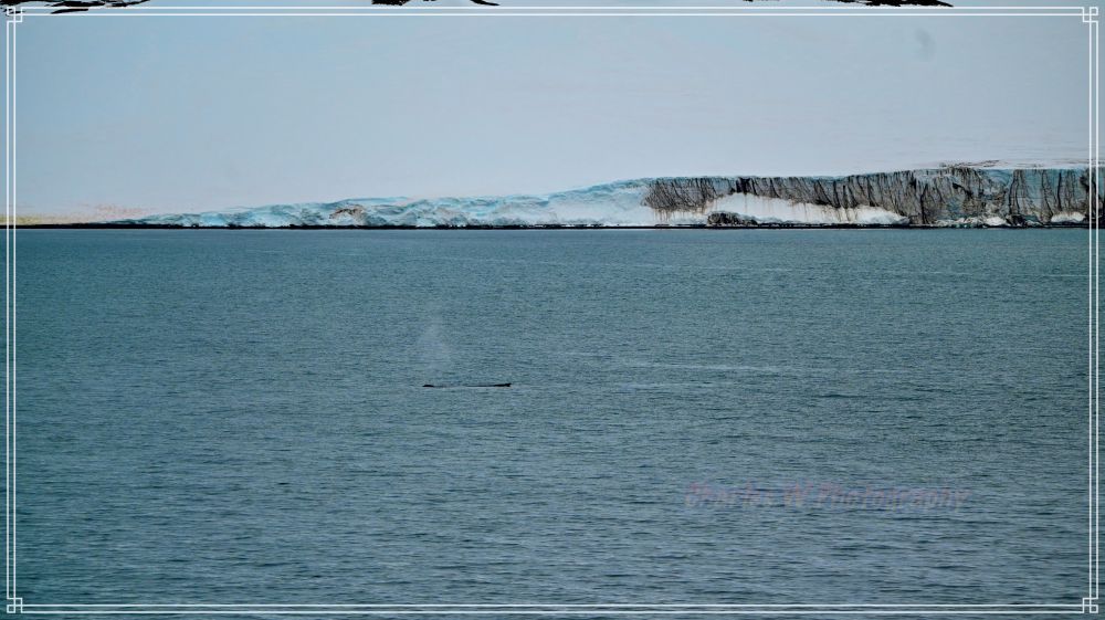 远处冰川的蓝色裂隙在阳光下闪耀, 碰巧海面上有一头鲸鱼在呼气。艇上领队提醒大家:“今天着陆是湿地,注意防水“。