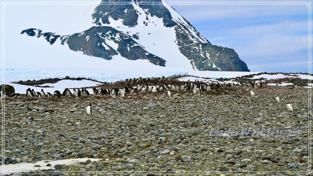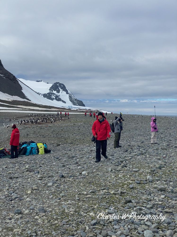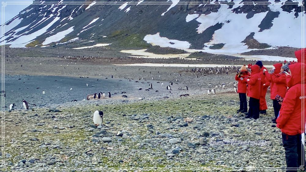 一下艇,脚踩进冰冷的浅水,瞬间感受到南极的一丝寒意。但更震撼的是眼前景象:成千上万只金图企鹅在沙砾滩上忙碌着!据估计,这里有约4,000-5,000对繁殖中的金图企鹅家庭,密密麻麻分布在海滩、斜坡和小水塘周围。空气中弥漫着淡淡的海洋气息,混合着企鹅栖息地特有的“生机味道(企鹅味)”。