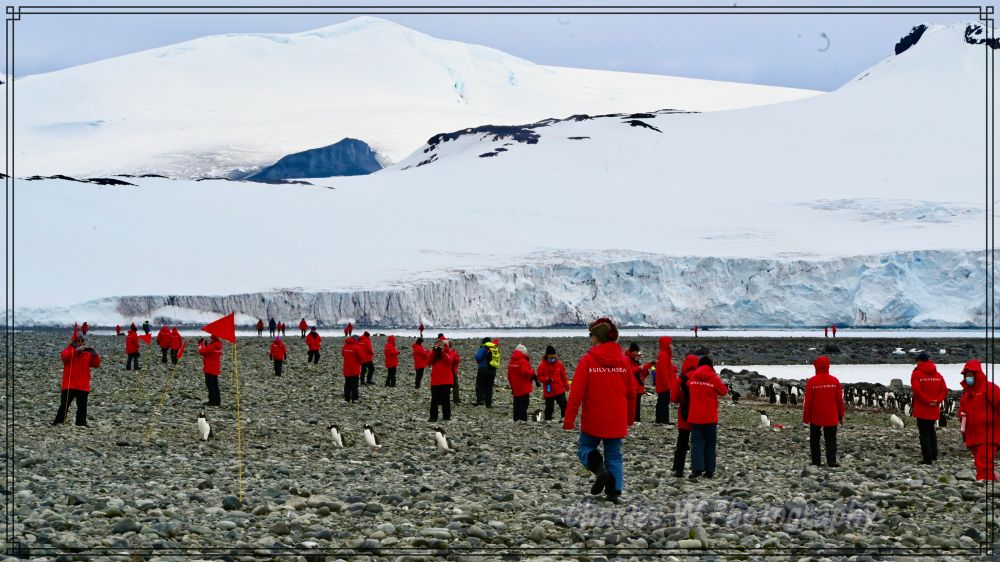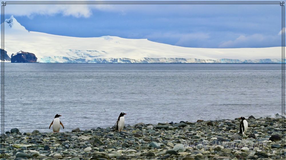 远处还树立着刻有智利字样的锥形标志,似乎告诉大家,这地方为智利所有 (也许以前,也许为以后),标志周围都是站立着企鹅群,