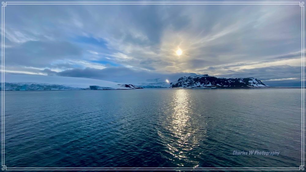 看眼前的雪山之上,太阳已是老高的了,提醒我们这是南极地区,没有完全的黑夜,太阳落下去,带着余光一会儿又升起来 (近乎极昼))。太阳周边似乎长出了刺,阳光映照在南大洋里,反射出耀眼的光芒,难怪在极地一定要戴上防紫外线强的墨镜,雪山间有大型的冰川。