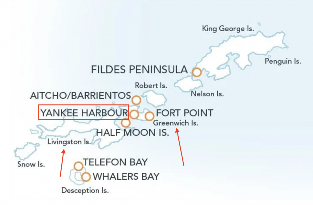 不久,洋基港那标志性的半月形长滩逐渐清晰。洋基英文是“Yankee” ,指的是 19 世纪初的美国捕海豹船(多来自新英格兰地区)。1819—1825 年间,这里是南极最早的人类活动区域之一,港湾平缓、便于靠岸,曾是捕鲸者和海豹猎人的重要停靠地,如今已没有人定居,只是一个观赏金图企鹅(Gentoo Penguin)的大型栖息地。