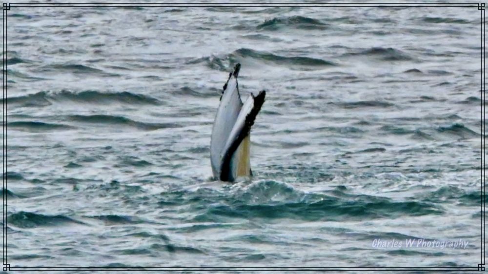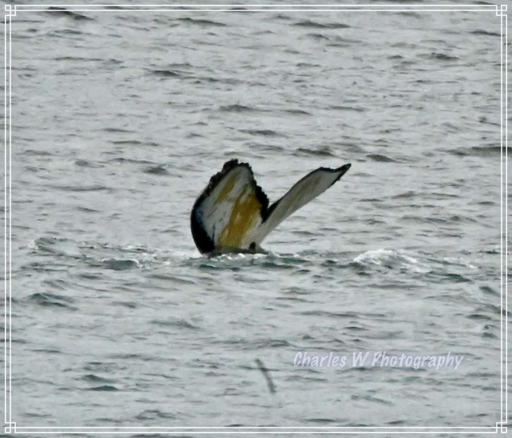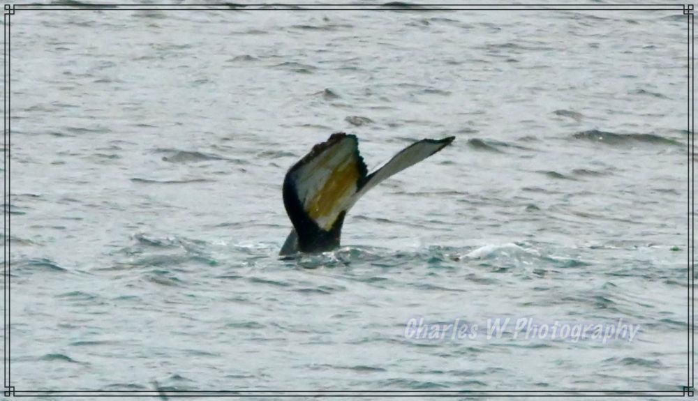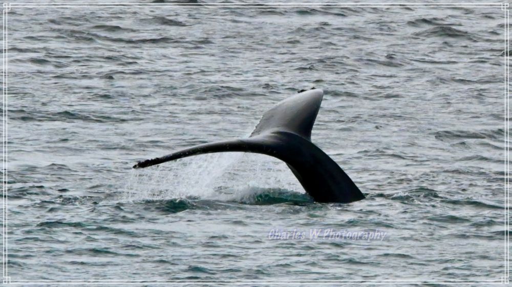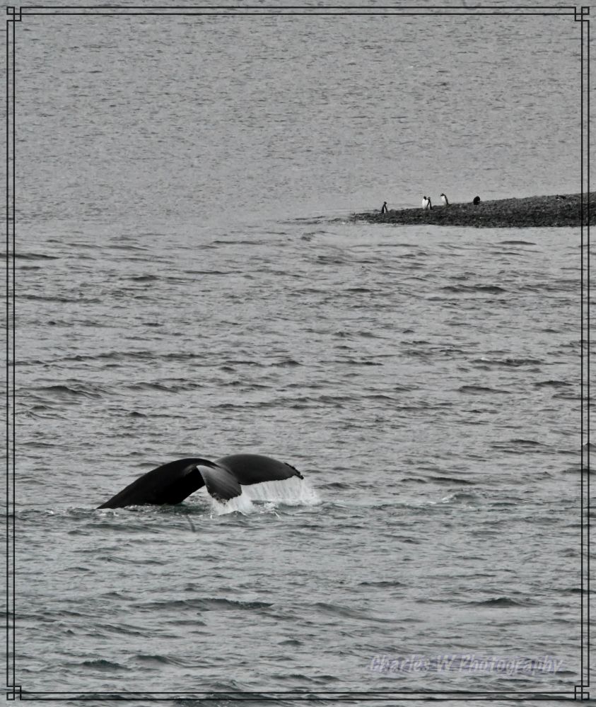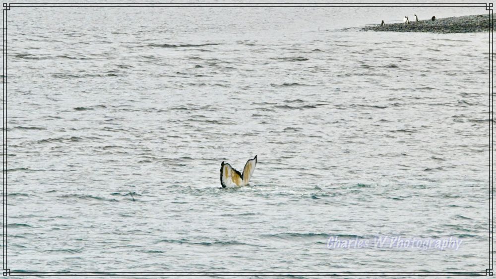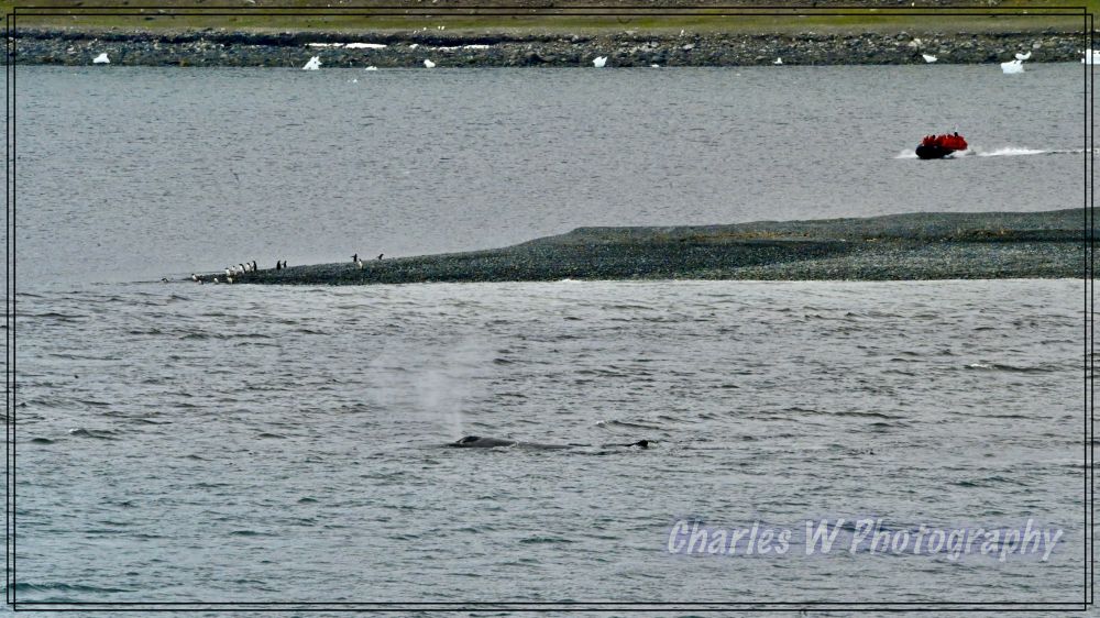 轮到我们这批登上了冲锋舟,引擎低吼着驶向岸边,刚刚驶出不久海面平静,舵手就说,右前方1点中的位置有三条鲸鱼(座头鲸 ,humpback),大炮抢拍终于拍到了鲸鱼尾巴,包括黑面和白色花纹一面,背景远处陆地上有企鹅。