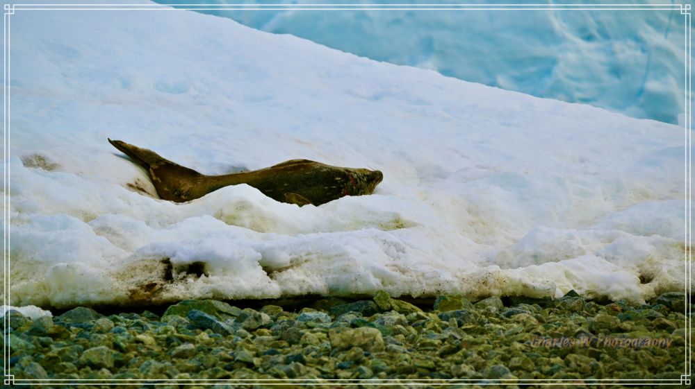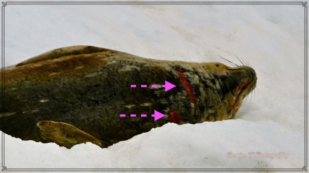 Vasper减慢速度,我们慢慢靠近一座冰山,只见一只海豹懒洋洋地趴在冰面上晒太阳。巡游的时候以为它只是睡觉休息,等到整理照片放大时,在发现这是一只受伤的海豹,在颈部下面,胸前处有一道深长的伤口,下面有一个小伤口,里面的肉都开得见。估计是与对手打斗受伤的,怪可怜的,可是这就是动物界,弱肉强食,胜为王败为寇。