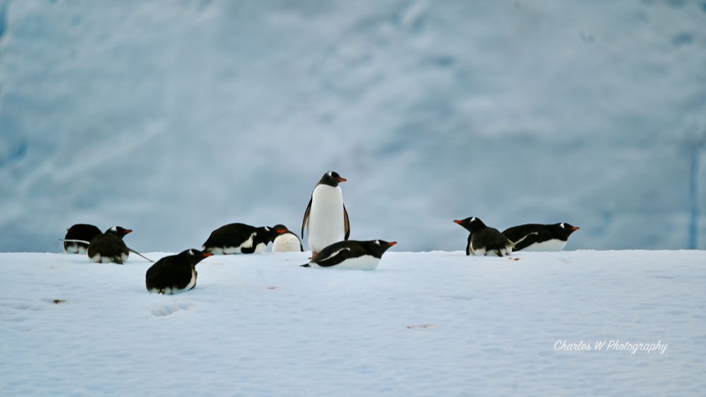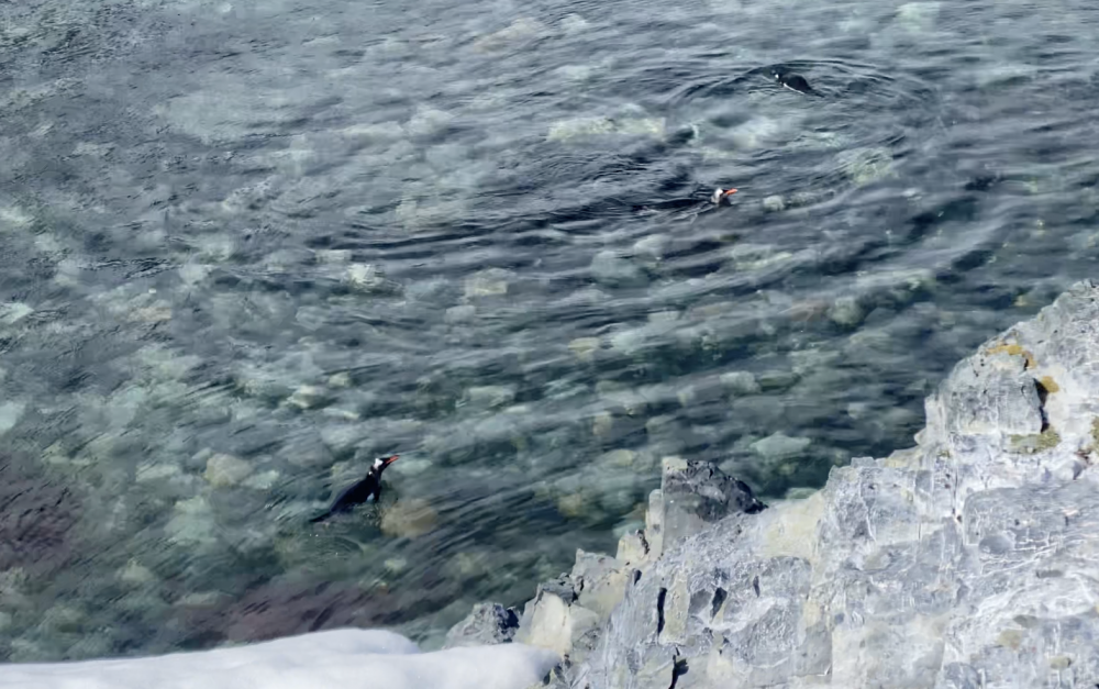 一上岸,最先扑面而来的是帽带(chinstrap)企鹅的叫声。它们零散分布在岩石坡和雪地上,有的在整理羽毛,有的成对站着像在开会。还有的在水里游泳。