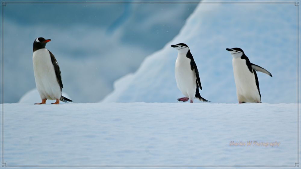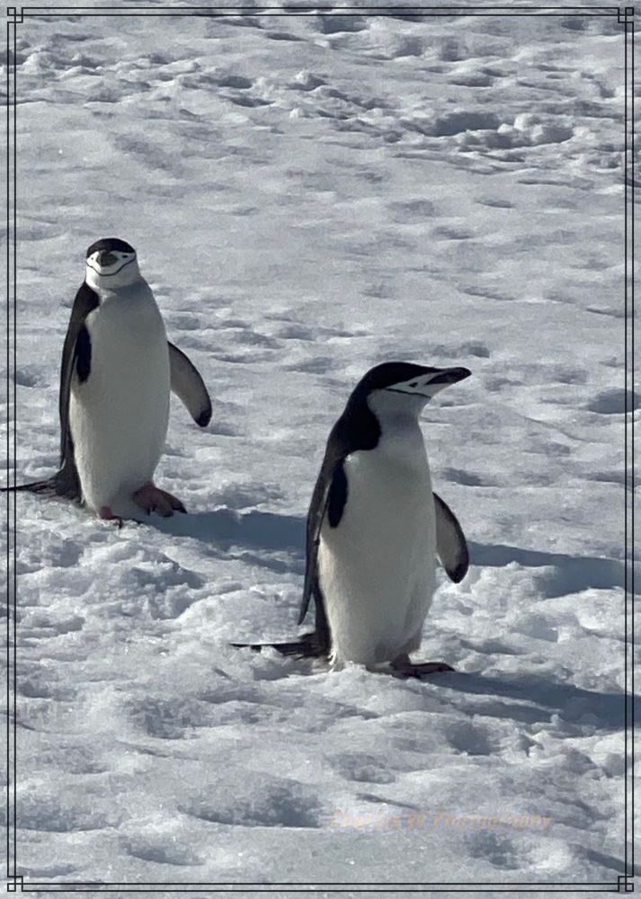 有一对帽带企鹅大摇大摆地在雪地上从高处往低处走,边走边歇着,看着我们这些人类。