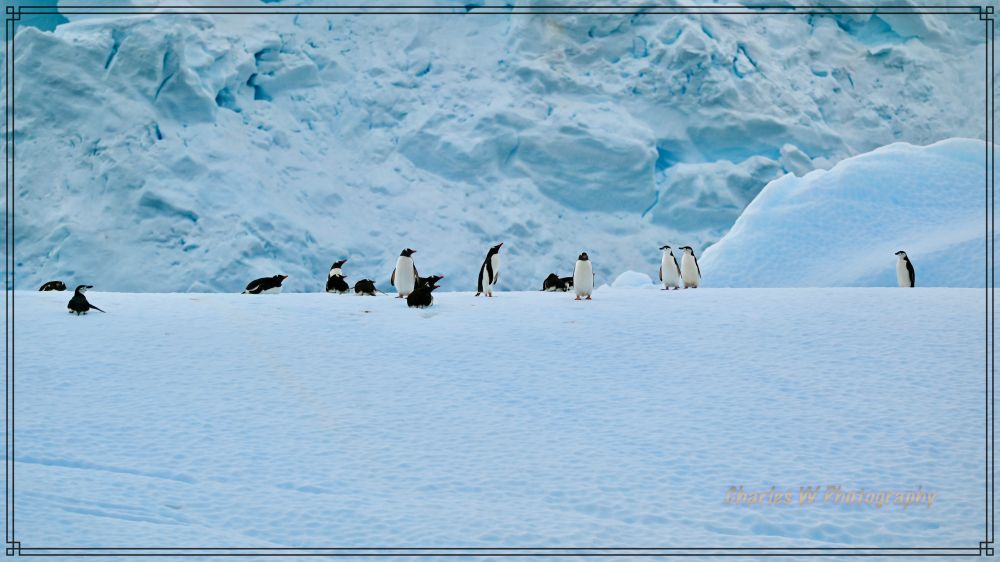 还是看到很多企鹅站在冰雪上 (帽带企鹅和金图企鹅常常混在一起)和海鸟。