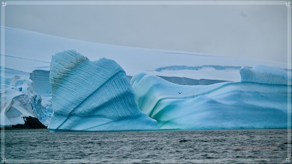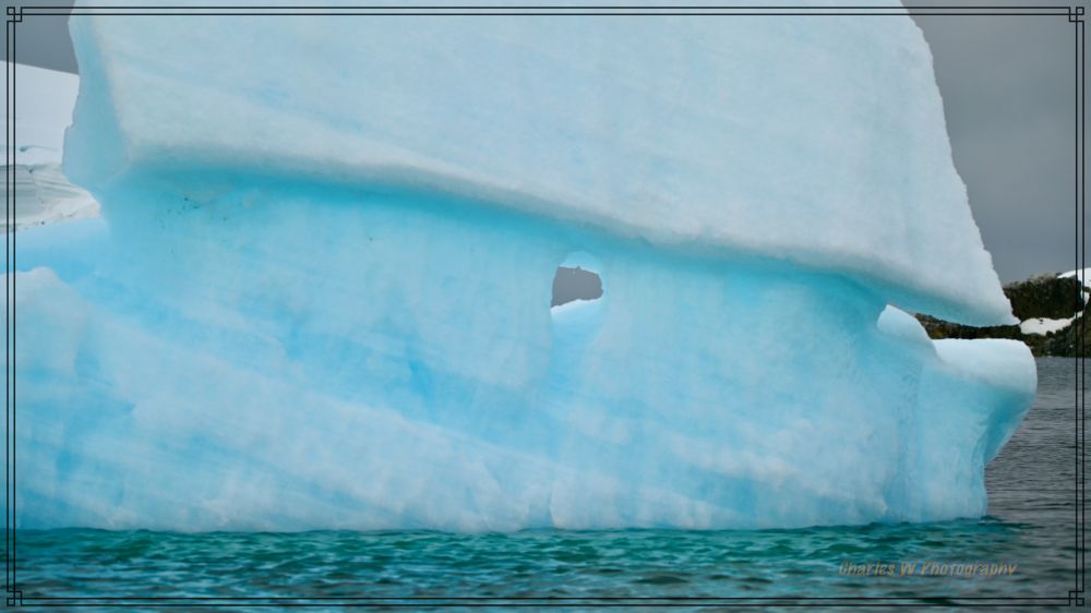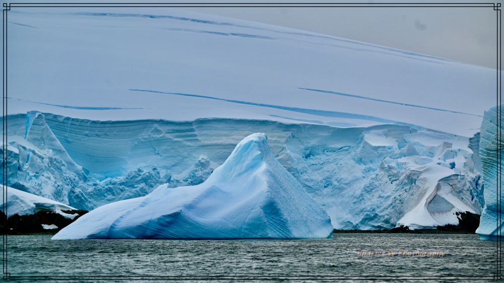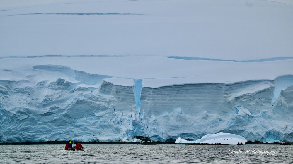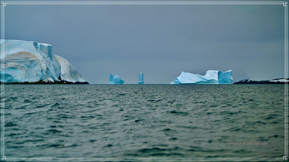 一驶进岛屿间的水道,就完全进入了另一个世界。巨大的 tabular冰山矗立两侧,有的表面裂开蓝得发亮的裂缝,有的被风雕琢成奇异的雕塑形状,冰山造型千奇百怪,有的像拱门,有的有“穿孔的”,有的像蓝宝石雕成的堡垒,海水在冰层下激荡,发出幽深的低吼。