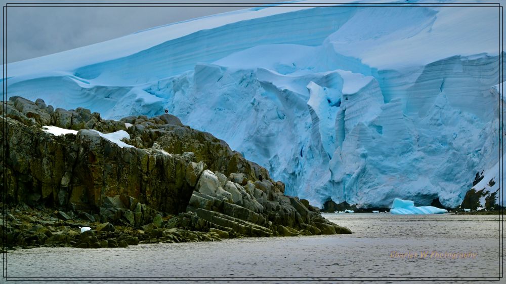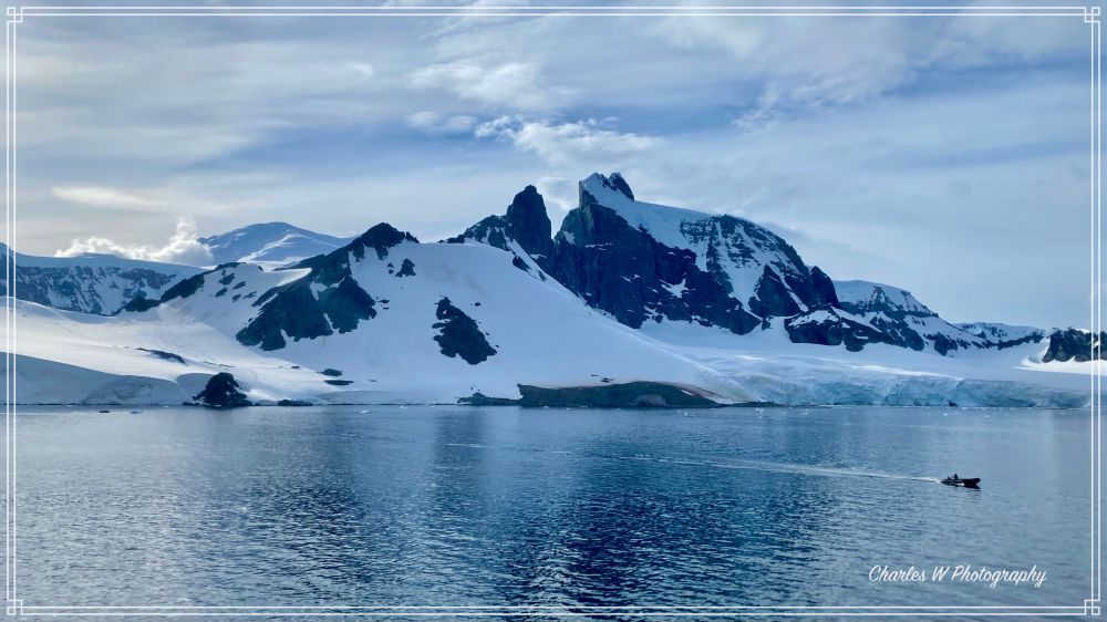 奥恩港是一个只有一英里宽的小海湾,藏在Graham Land西侧的Danco Coast,这儿有帽带企鹅的栖息地,周围被陡峭的雪山和冰川环抱着。极地的阳光从天空中,从云层缝隙里洒下来,把海面和冰面映得闪闪发光,像撒了一层碎钻。
