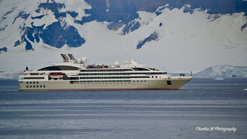 早上7点多,游轮缓缓驶入奥恩港(Orne Harbour)。窗外看到一条停泊在海面上的像是法国游轮-庞洛邮轮(Ponant)-星际号(La Lyrial),。看到一个同类,也挺兴奋的。