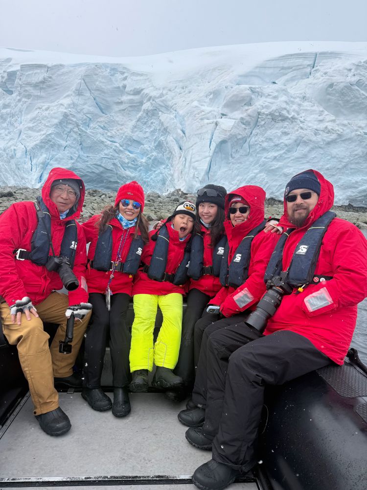 然而好景不长,大概3点半以后,天突然阴了,风也起来了。气温估计掉到了零下几度(虽然1月是南极最“暖和”的月份,但风寒效应非常明显)。冲锋舟上的人开始跺脚取暖,手指冻得发僵,连相机都快握不住了。海浪也开始大了,水花偶尔溅到脸上,像冰针一样刺痛。探险队员说“再转一个弯就回船”,大家咬牙坚持着拍最后几张冰山和远处雪山的照片。