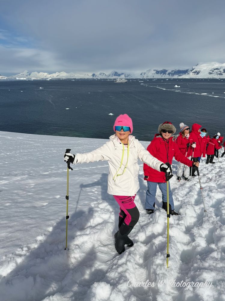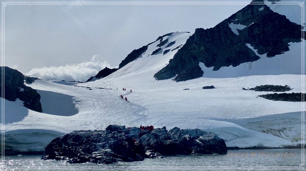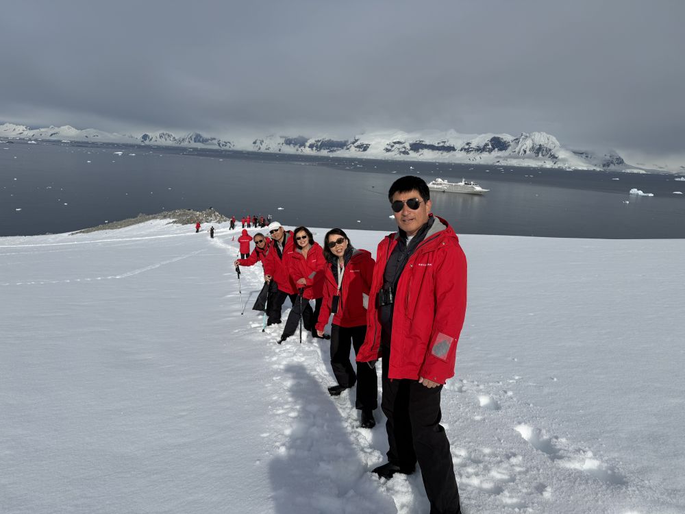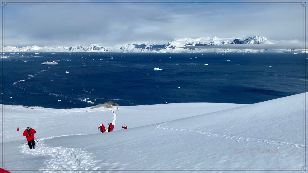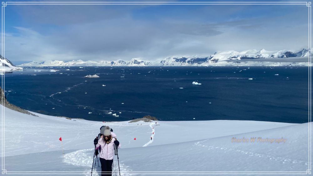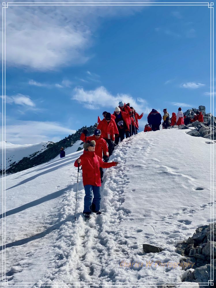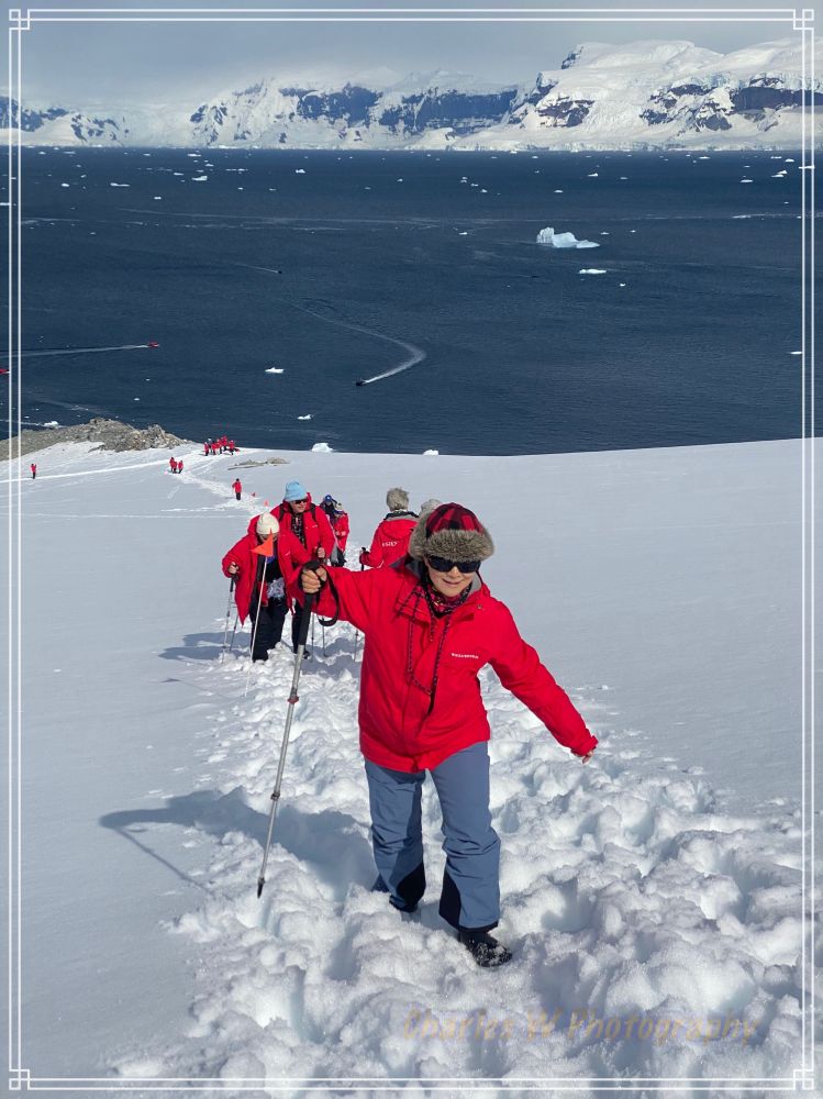 我们沿着插看红色旗杆标记的小径往上走,目标是去上方观景点。这里的重头戏是攀爬那座陡峭的雪坡。脚下的雪有些深,这是南极的多年累积的雪,每一步都必须踩得扎实。随着海拔升高,呼吸开始变得急促,走一段要停下休息一会,每一步都要小心。