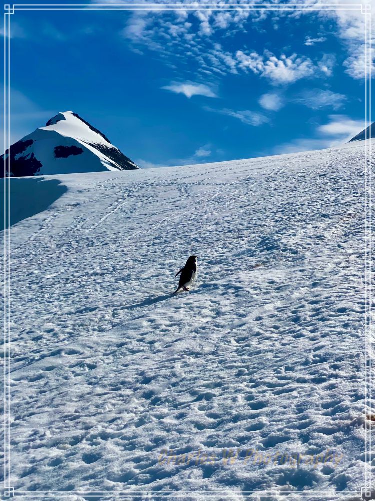 另一面有一只孤独的帽带企鹅在雪地里使劲地往山上跳跃上爬。