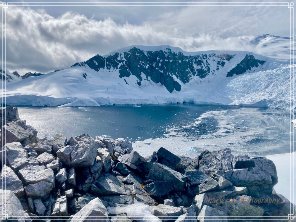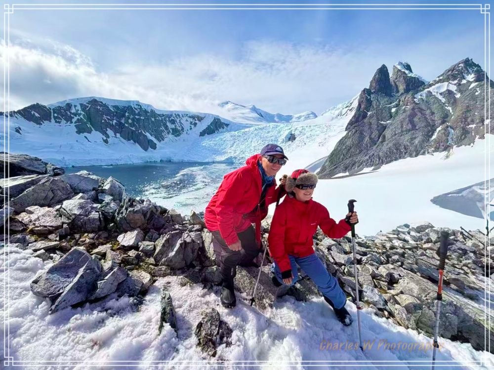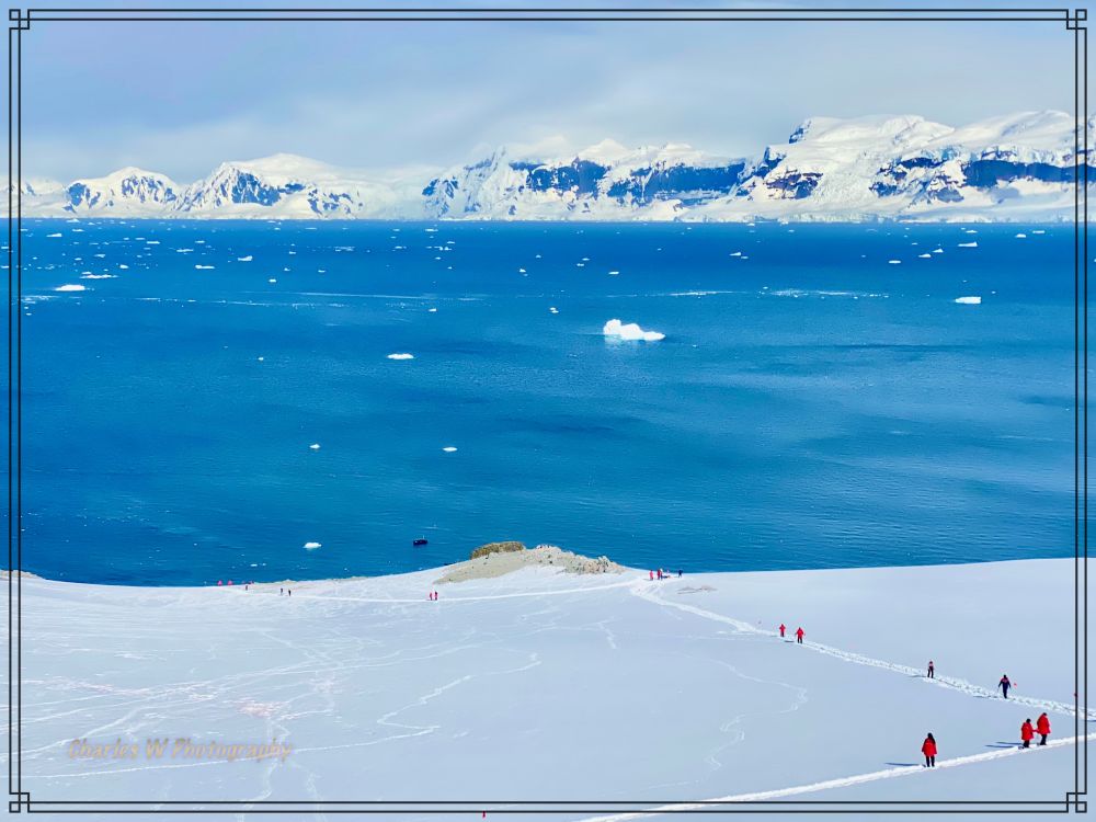 回头看,海湾像一幅被上帝随手泼墨的画:深蓝的海水随太阳光的强弱而变化深浅、漂浮的冰山、白得发光的冰川,再远处是Gerlache Strait开阔的水道, 风很轻,空气冷但干净,呼吸一口气都觉得肺被洗过一样。
