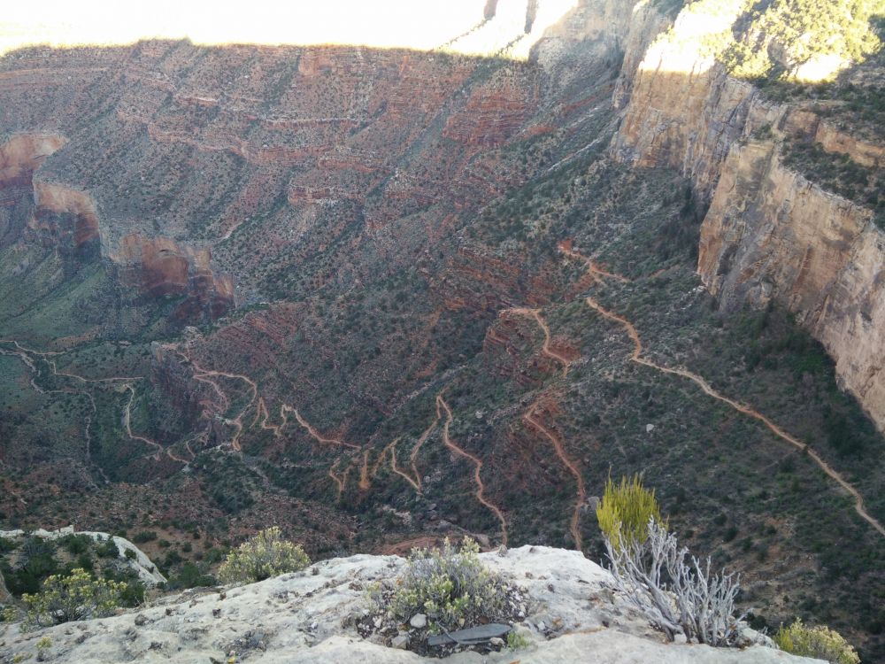 遇到路过休息的,我就和人家聊天。碰到各种各样的人,各种各样的经历,还挺有趣的。一位老先生,聊起来是在virginia beach出生长大的。说起princess ann, mount trashmore,托那谁谁的福,亲切的紧呐!老先生因为工作原因搬到大峡谷附近21年了。多年来坚持每两三个星期就在大峡谷进行一次rim to river to rim的hiking,当天来回噢!他自豪的说,this is my playground! 实在是让我又羡慕又敬佩。和他一起的还有另外两三个老头老太,都是经验十足的。他们帮我从新清理了伤口,细心包扎好,又告诉我上去后去general store买ankle support才离开。跟着他们又学了点急救小知识,诸如什么如果丢了,要对着路过的飞机晃手电筒,飞机会用radio通知地面搜救什么的。总之这些愉快的小聊天和美丽的风景让我这一个多小时的等待一点儿问题也没有,反倒挺享受的。