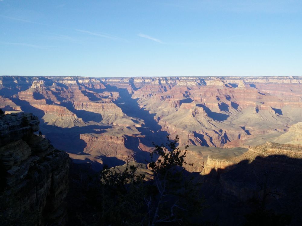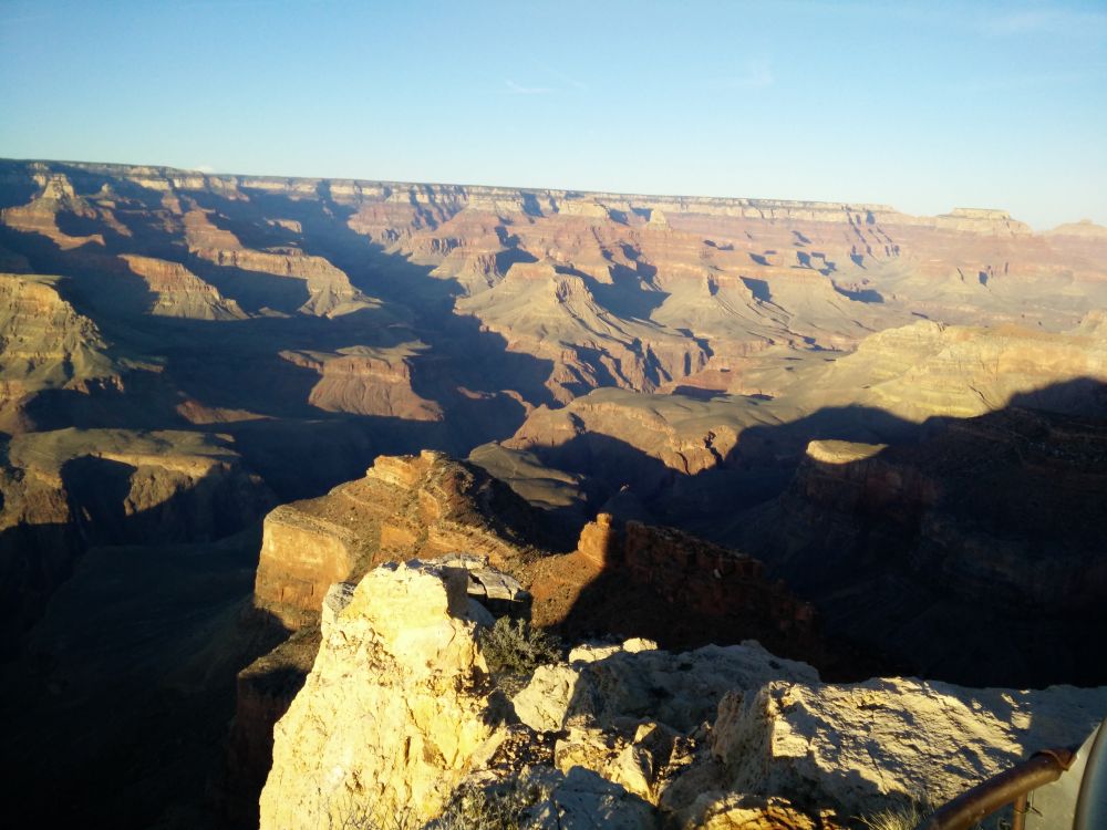 3月25号。大峡谷一整天。一大早进公园,我们的四年级小朋友就受到了热烈欢迎。我们其他人都是作为他的guest被免费放入的。趁着精神好,我们就先奔着south kaibab trail去了,打算在体力最好的时候hiking,下到cedar ridge再上来。车停在visitor center,我们坐公园的shuttle bus到了trail head。一下车我们就被大峡谷的壮丽气魄震慑了。这高度,让人往悬崖边是禁不住腿软啊!