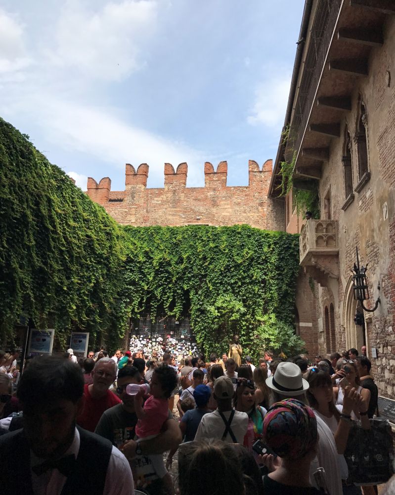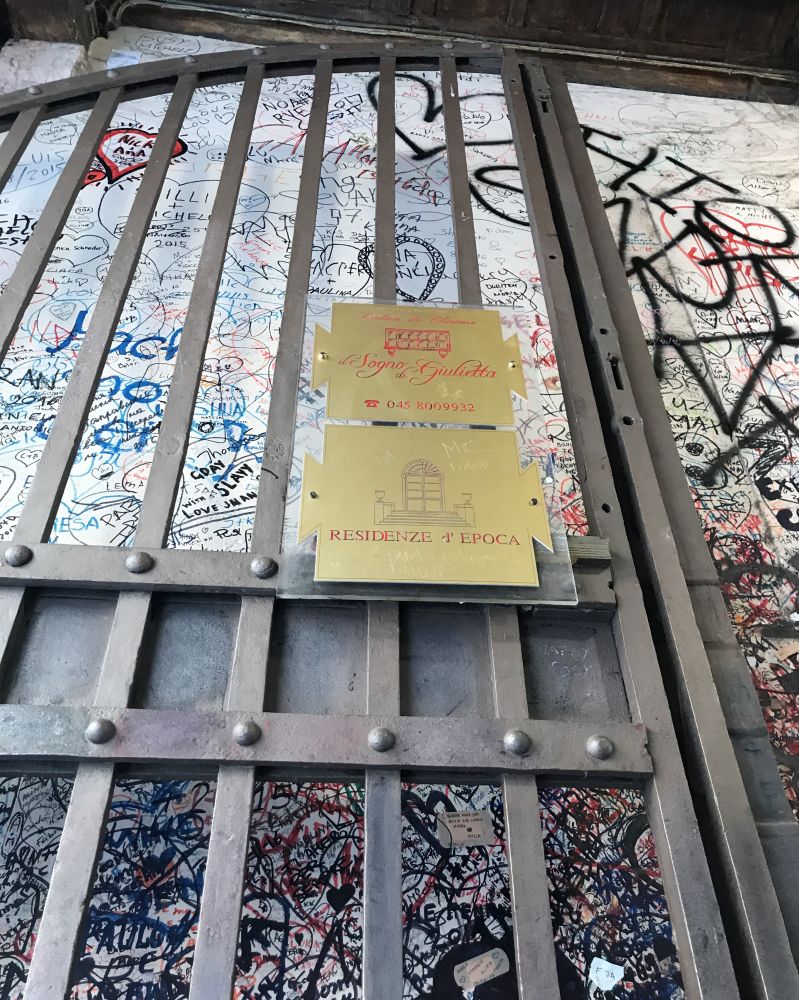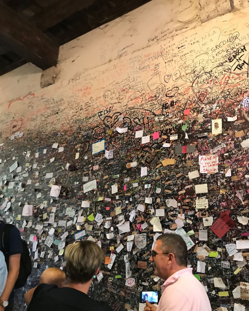 离开广场,经过熙熙攘攘的步行街,来到朱丽叶家族的楼房。到了之后才发现那里简直是人满为患。进入小楼两边的墙上写满了来自世界各地各种爱的语言。更有甚者写到了离地面三四米高的地方,也不知道是怎么做到的。我们也凑热闹在墙上粘了字条。