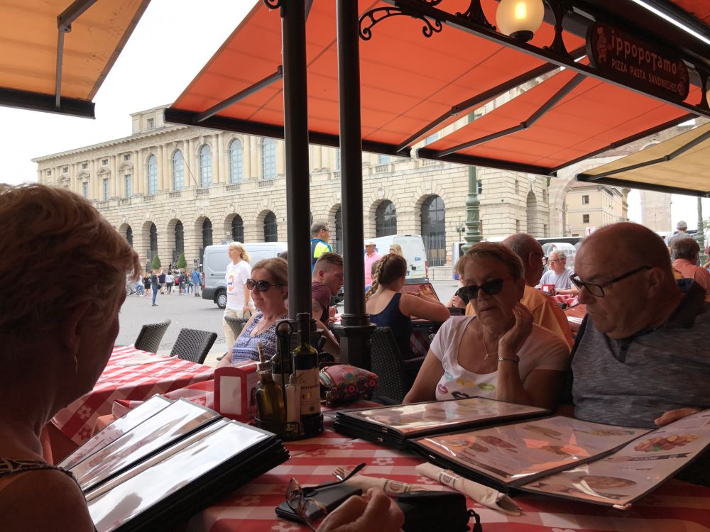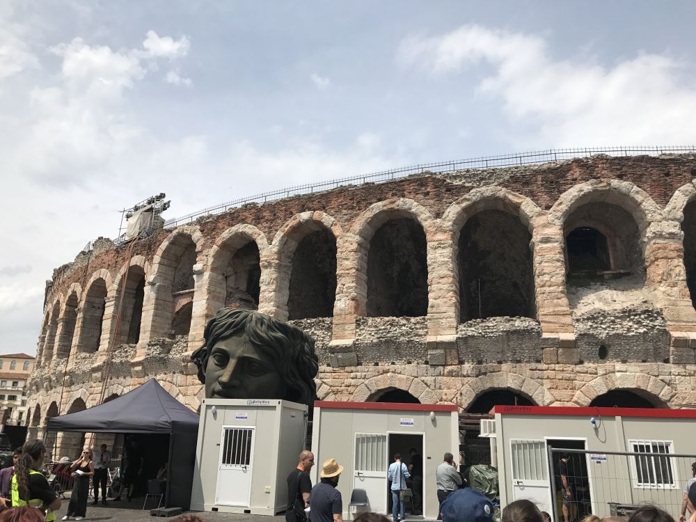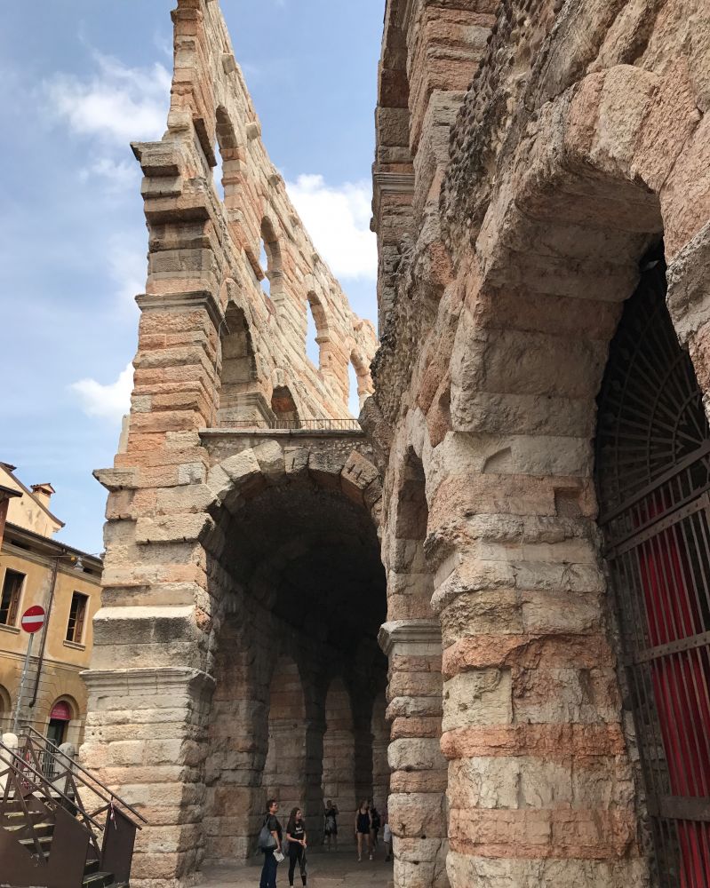 这家饭店地理位置得天独厚,边上就是Verona最大的景点之一 - 竞技场。这是意大利第三大竞技场,建于公元30年,居于罗马斗兽场和那不勒斯Cupua之后。虽然我们已经看过了前两个,那天的运气却不是特别好。当天晚上里面有一场流行音乐会,歌迷们早早的排上了队,里面就不让参观了。到处可见警察军队在维护秩序, 可是这并不影响我们感受竞技场带来的视觉上的冲击。我们沿着竞技场走了一圈,看着那些断墙残垣在几千年后依然巍巍耸立,似乎能想象当年的热闹和辉煌。