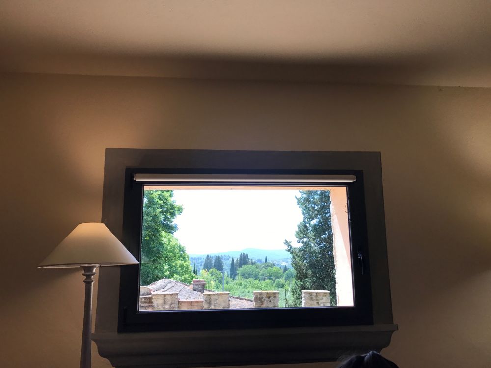 厚厚的金属钥匙拿在手里沉淀的。穿过走廊,上了旋转楼梯,到了顶楼。站在门口等着开门的时候,我真的没有特殊的期待。开了门之后,我们都呆住了。巨大的房间布置的十分精致舒适。大大的落地窗装饰着美丽的窗帘,能隐隐看到窗外的无边绿色和树叶摇摆的轮廓。大沙发,小沙发,书桌,大床,小床和各种家具摆得错落有致。旧木头地板依然亮亮的,些许的凹凸不平却又是那么和谐和理所当然。在那个瞬间,我们似乎都幻化成了公主和王子。而你要是从那几个镶着镜框的小窗口望出去,每个入眼之处都是一幅完美的意大利田园风光。