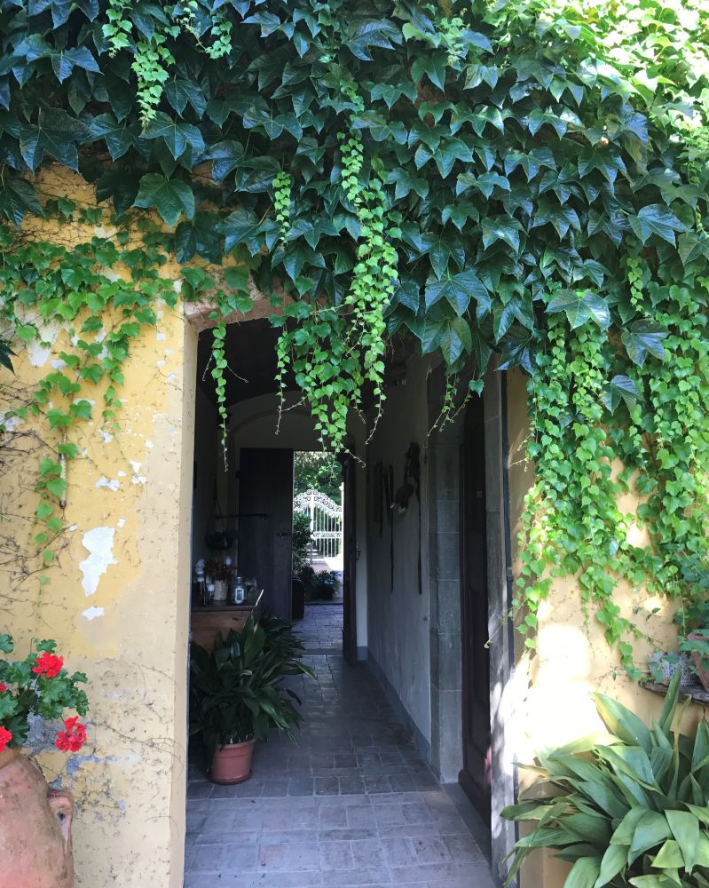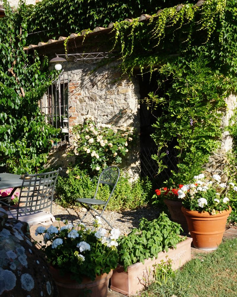 下楼继续我们对城堡的探索。穿过爬满青藤的小门,是一个美丽的后花园。巨大的草坪有着矮矮的砖墙坐落在小山头上。一眼望去,郁郁葱葱层次鲜明的意大利田园风光似乎看不到头,真是美不胜收。在大树下花丛里,藏着一个小厨房。第二天的早餐将在这儿享用。城堡里每个角落似乎都是零零散散几百年来几代人积攒的照片,工具,艺术品等等。