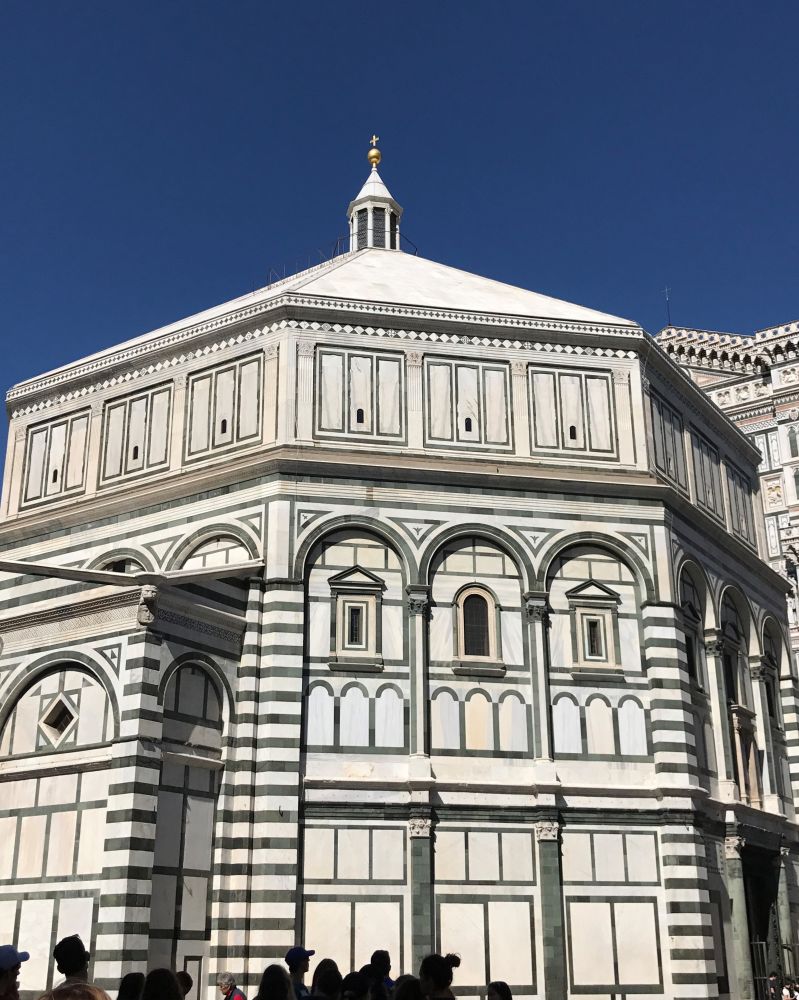 圣约翰洗礼堂白玉般的圣洁。八边柱形的建筑本身以及那几个大门上的艺术品都闻名于世。其中以被米开朗琪罗称为天堂之门的东门青铜镀金浮雕最为有名, 被公认为文艺复兴时期最杰出的代表作之一。它的内部最有名的艺术品则是穹顶最后的审判马赛克玻璃窗,其中那要下地狱的人所承受的痛苦之状比我所读到过所有的描述都要惊悚恐怖。