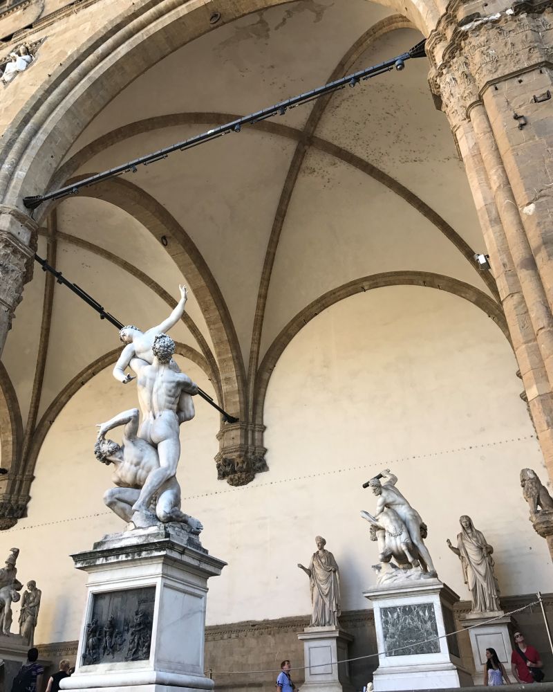 看完这些,开始往Uffizi Galary走去。途径Piazza della Signoria露天博物馆。这个建于十四世纪的博物馆,是佛罗伦斯的政治中心,收藏了十几座雕像,其中有大卫的复制品和其他有名的雕像。走累了可以买个Gelato,坐在台阶上休息,看游人百像。