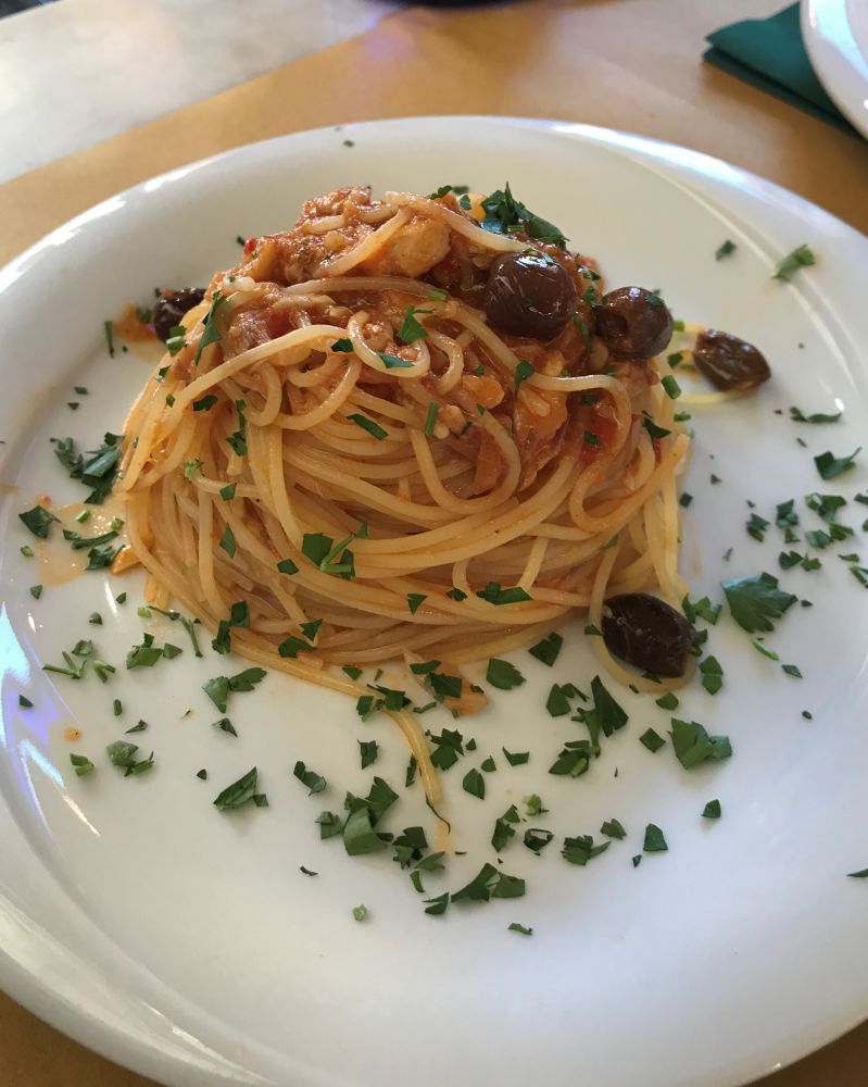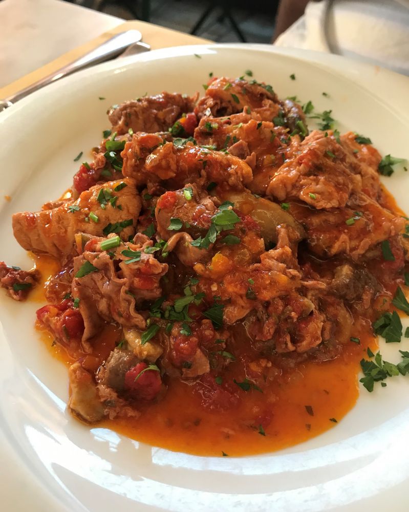 这时已近黄昏,我们开始往米开朗琪罗广场走去。走到广场下快开始爬坡的地方有个饭店,正好吃晚饭。服务生是个二十岁多的小伙子,从外地来Florence打工。英文不错,也很健谈。我们边研究菜谱边和他聊天。他听说我们是美国去的,就笑话说美国的意大利菜太不正宗啦,比如说Chicken Parmesan Pasta这道菜意大利根本没有。然后又介绍了Tuscany饮食历史,说就是下里巴人的吃食。让他这么一说,我们纷纷开始自我挑战,要吃最正宗的Tuscany食物。于是挑了红酒炖兔子,西红柿炖牛杂,鸡肉抱子甘蓝和红辣椒意大利面条。每样看上去都很朴素,却都很美味,大家大快朵颐,以至于后来坐在我们边上的游客都来问我们点的是什么菜。