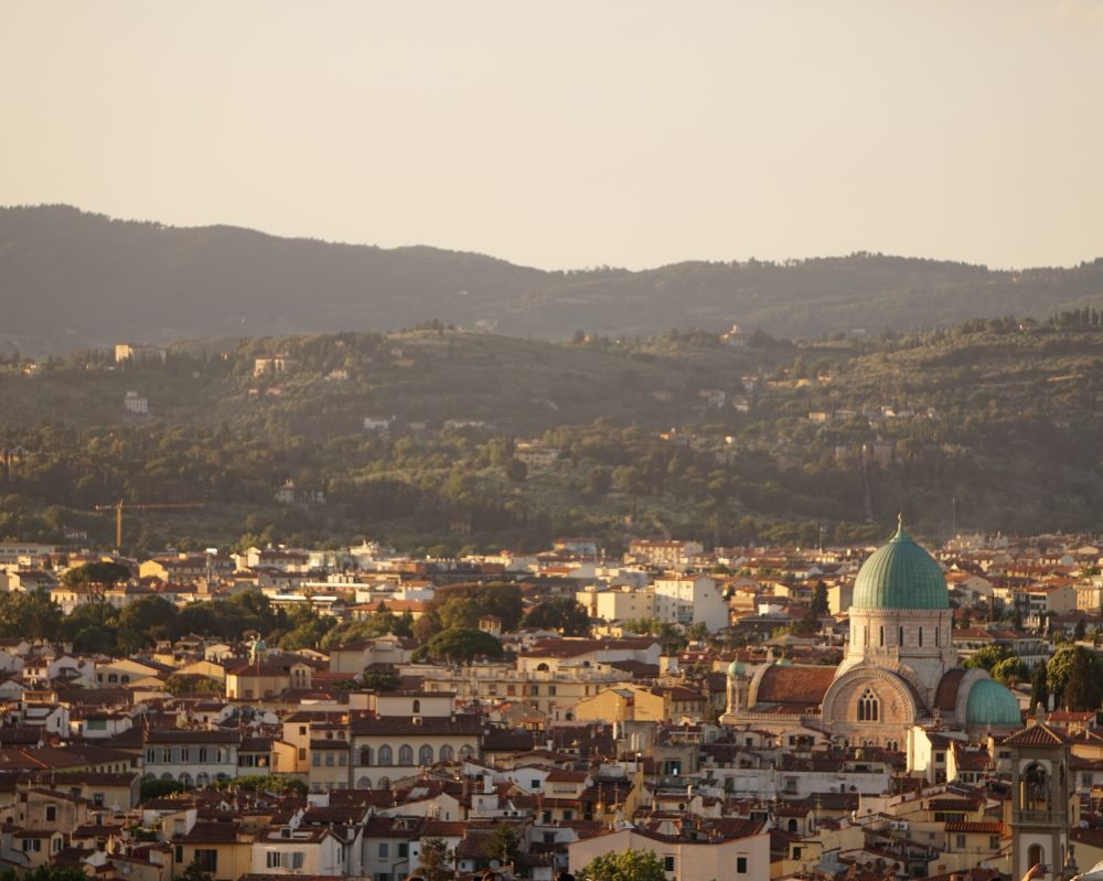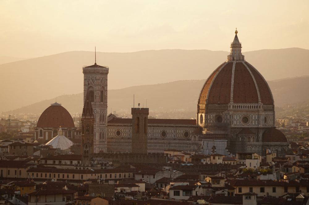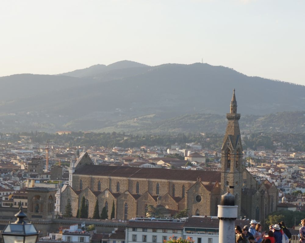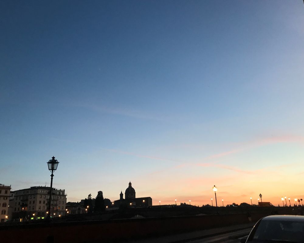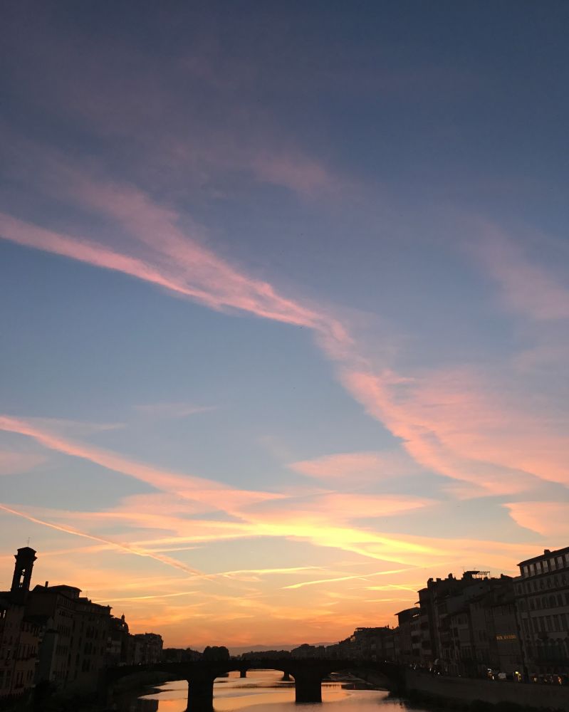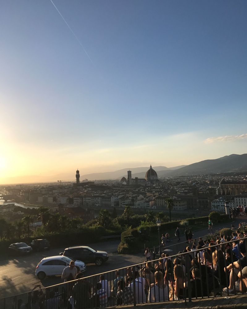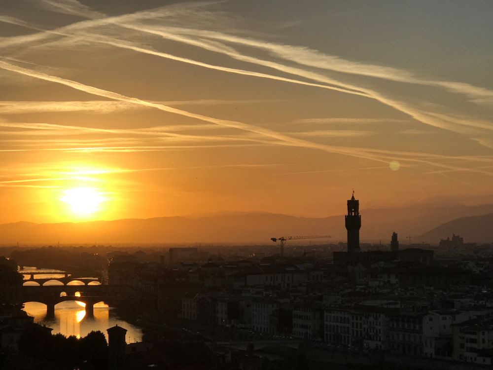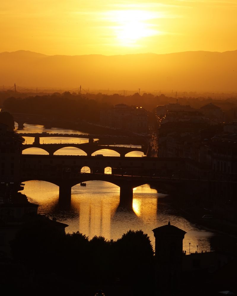 人们已经三三两两的在西面的台阶上广场上聚集。我们左看右看,决定呆在广场的围栏边,视野更高一些。我们边上的年轻情侣准备充足,带了美酒,高脚酒杯和比萨饼。这时候夕阳开始西下,淡淡的给所有的建筑都披上了一层金纱。随着夕阳下落,晚霞越来越亮,越来越美丽,目光所及之处都镀了金,各种美丽多彩的建筑物在视线中跳出来,似乎就在眼前。远处的Arno河静静流淌着,一座座小拱桥在鎏金的水上美丽极了。大家都沉浸在这美景中,久久不忍离去。