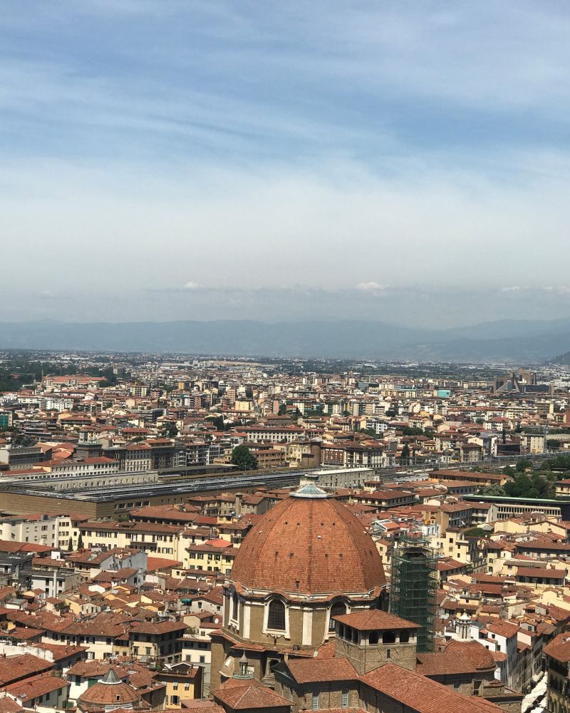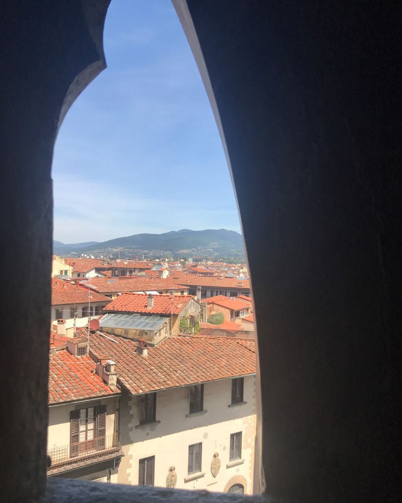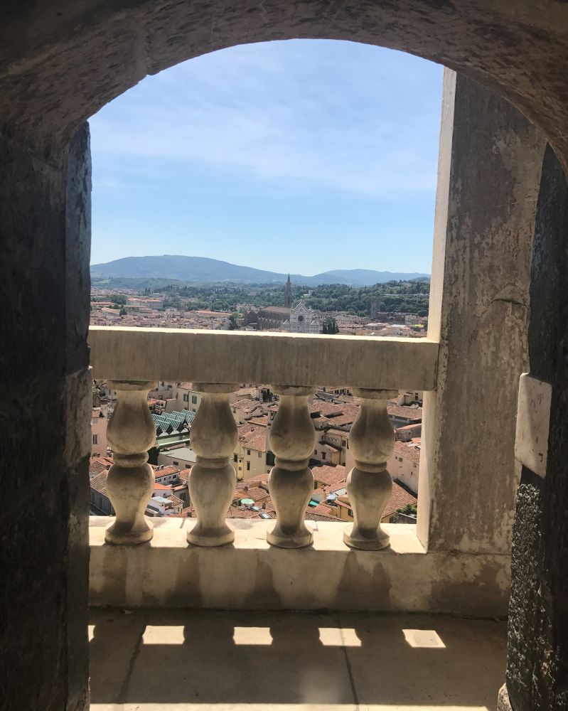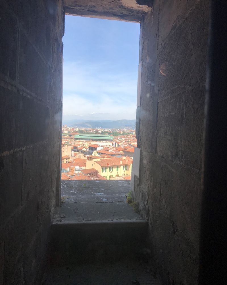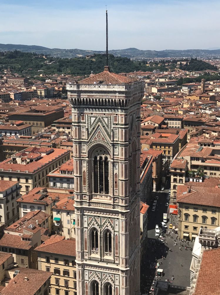 越往上楼梯的空间越狭窄,到了最后一段楼梯非常狭窄,连我这个从来没有幽闭恐惧症的人都有点儿快受不了了。最后一段坡度也大,几乎直上直下,对有些人来说可能有点儿有难度。到了顶层之后能眺望整个Florence, 或者近距离的欣赏钟楼的细节,还是非常推荐的。