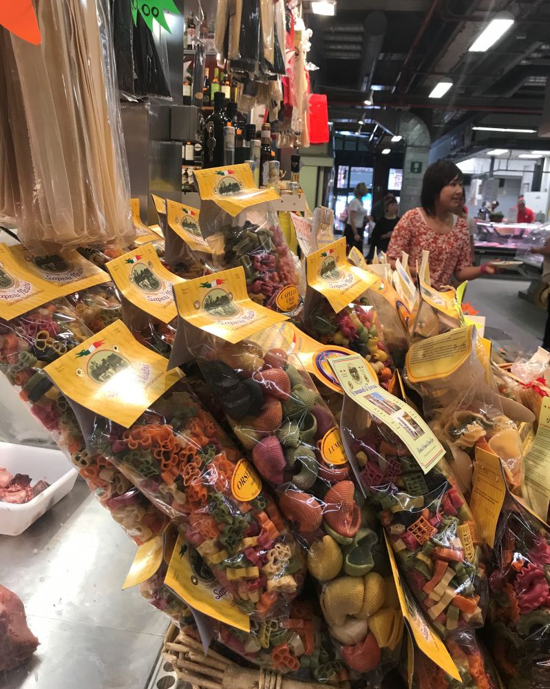 可是Florence哪能愁没地方去呢?我们往Lorenzo市场走去。市场分两部分,露天的和室内的。露天的市场卖的大多数皮制品什么的,没有打算买什么,我们直奔室内而去。一楼很象中国的农贸市场,从鲜肉到晒干的蘑菇到奶酪到各式各样的意大利面条,应有尽有。二楼则聚集着各种各样热闹无比的小餐厅咖啡厅。