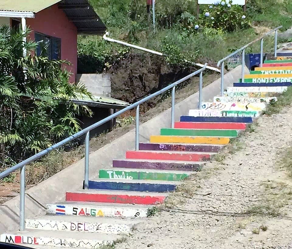 Monteverde旅游业太发达了。三步一个家庭旅馆,五步一个旅行社。在这儿有鲜美的食物,方便的超市和彩色的台阶。低头是尘土飞扬的土路,抬头是湛蓝的天空上云卷云舒。这座充满生机活力的城市明天又会给我们带来什么惊喜呢?