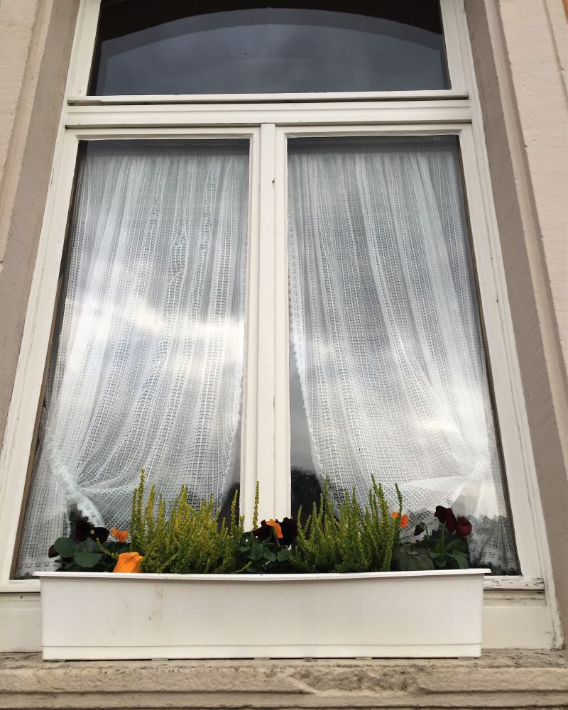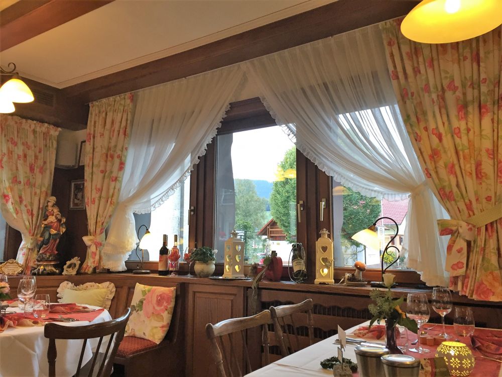 这家深山老林里的Bed&Breakfast布置得很舒适温馨,每个窗户都装饰着各种图案的白纱帘。