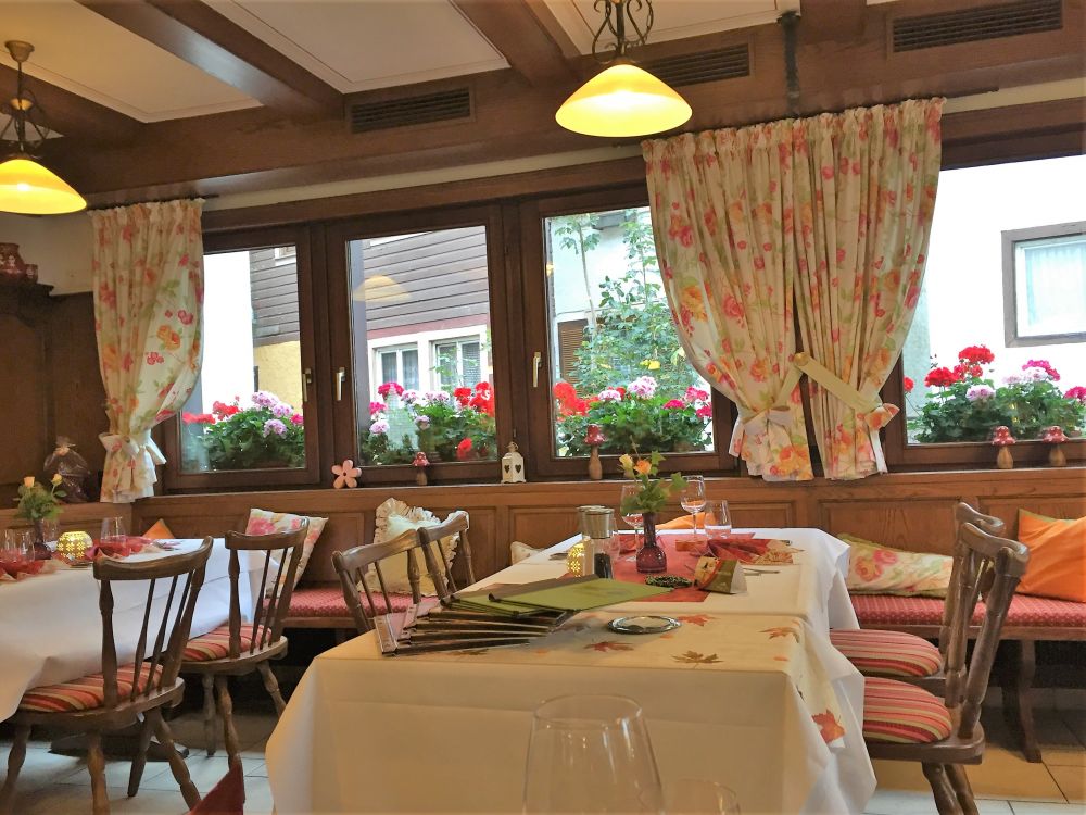 晚餐时间到了,在面包店里问了问老板哪家餐馆好吃,寻着门牌号去了。饭店入口极不起眼,其貌不扬,里面却是别有洞天。走进了饭店,人就立刻淹没在花海里。餐厅里布置的全是花,窗外的窗台上全是花,从窗口望出去河两边挂的都是花篮,原来这家饭店就在河岸上。。。