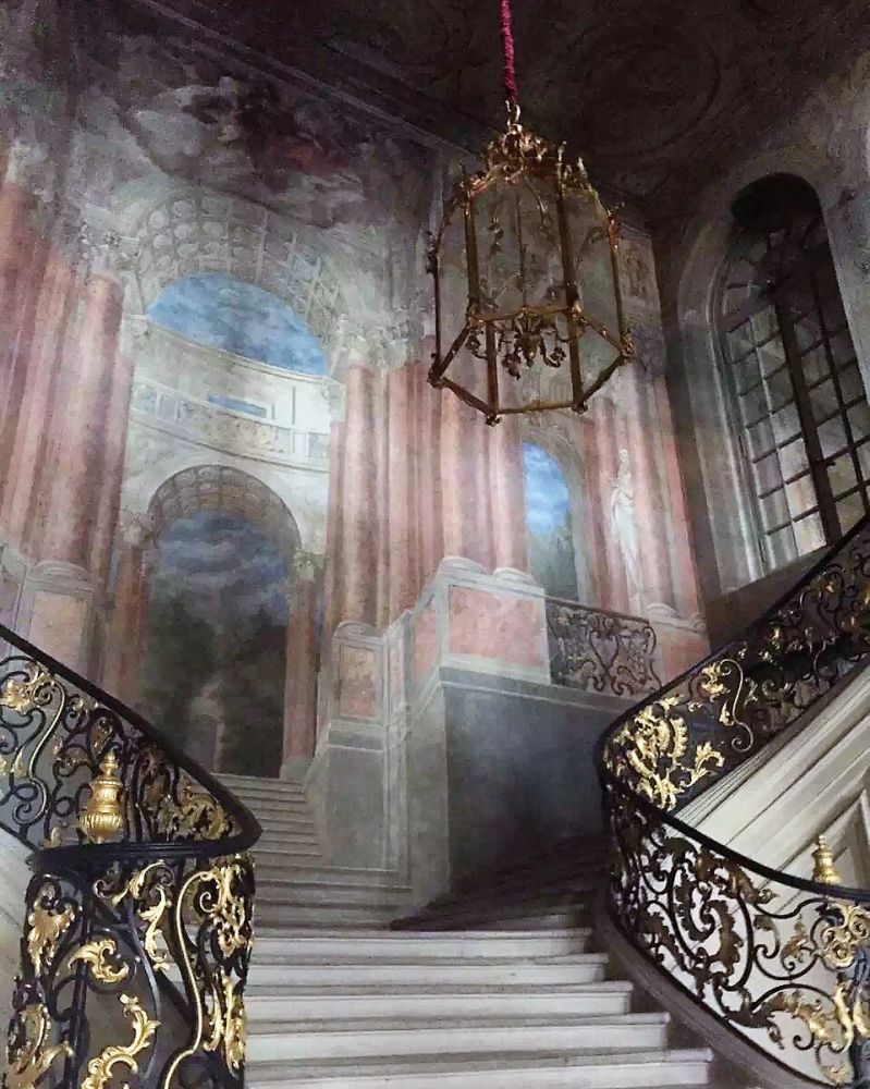 这个建筑群由六七栋宫殿楼房和之间的大广场组成,包括市政中心,歌剧院,宾馆等。最大的特色是这些建筑在对称中又有变化,在当时的欧洲是独一无二的。原先的宫殿变成了歌剧院,里面金碧辉煌,从大门到大厅到吊灯都镀着金色。大厅里的旋转楼梯加壁画美无绝伦,自然采光给壁画染上了梦幻般的色彩。