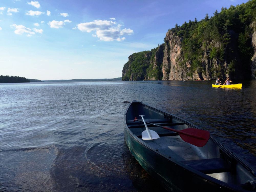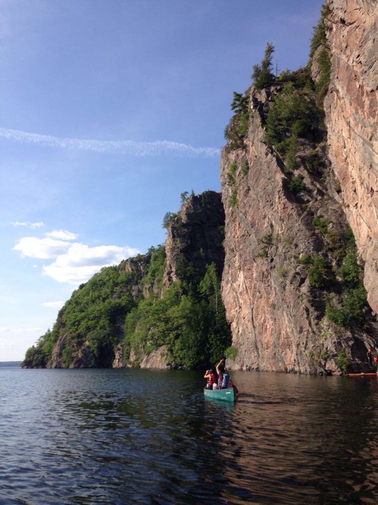 公园内的Mazinaw 湖,是安大略省大大小小25000个湖泊中,最深的湖之一。最有意思的是,湖中1.5公里的湖面悬崖,高出湖面100米,悬崖上保留了远古因纽特人的朱红色岩画及象形文字,悬崖的顶部是一条徒步旅行小径。我们租了两条独木舟,在微风中,泛舟于蓝天碧水之间。