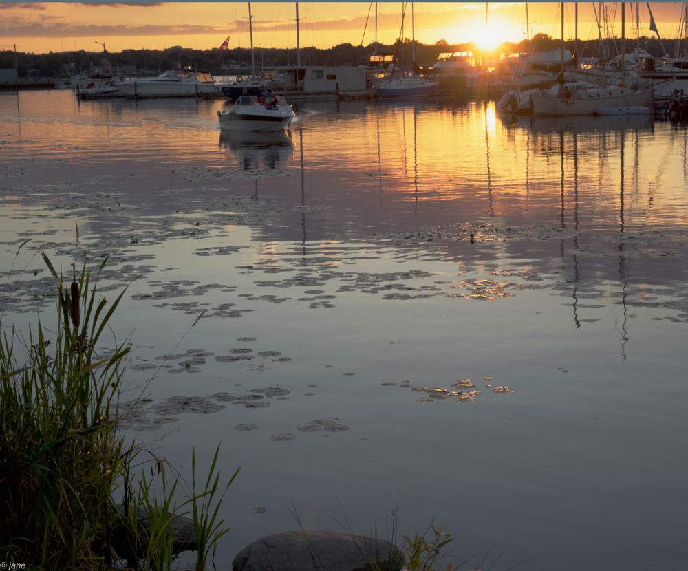 夕阳渐沉,水面一片金光。