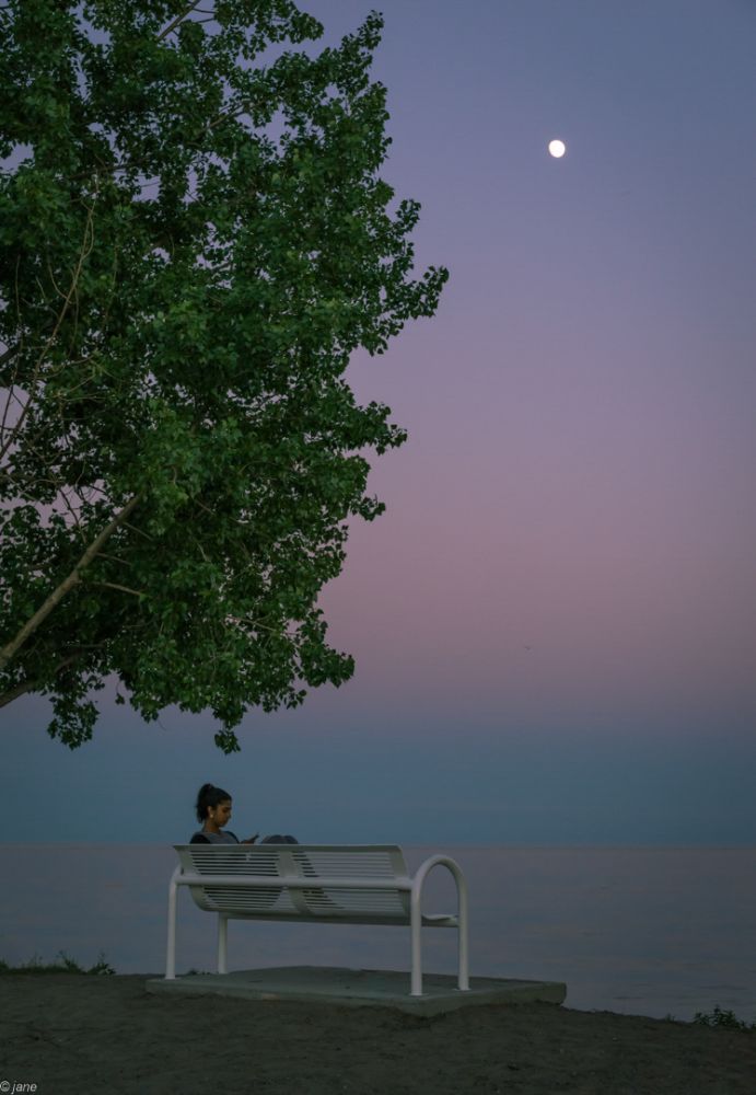 当落日完全沉入了水中,回望明月,惊喜地发现,月空下,湖水泛着淡淡的绿色,在那水天一线之上,渐变着的青橙蓝色,镶嵌着一枚银白色的宝石 --- 大自然的霓裳,浑然天成,淡雅之中分明透着高贵。