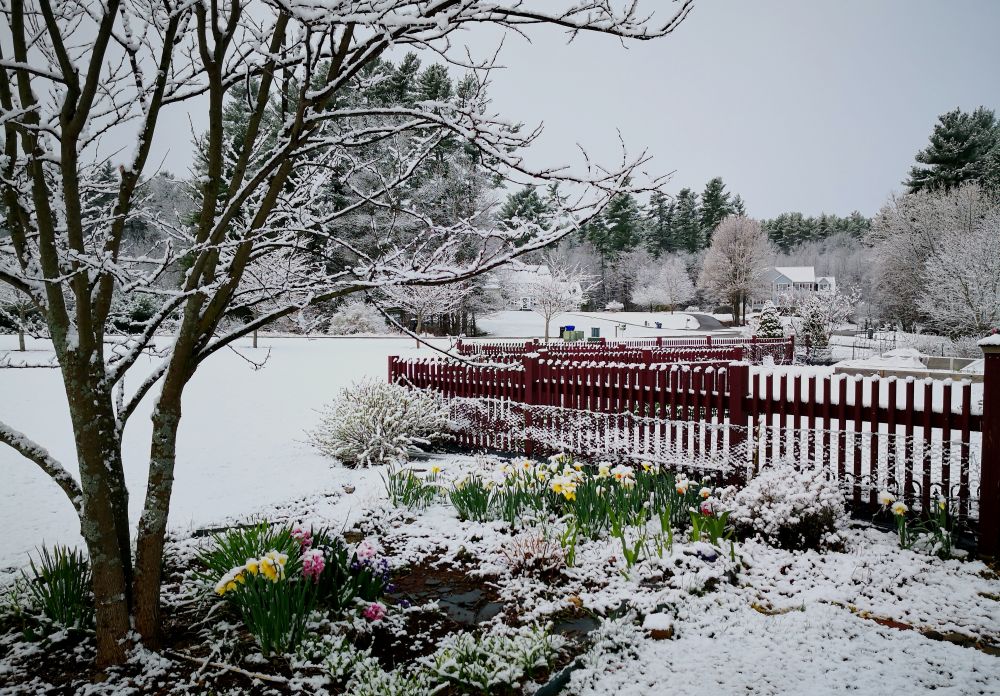 新英格兰的春天,是一场旷日持久的春与冬的拉锯战。今年宅在家里,有更多的时间仔细观察,其中不乏戏剧性的场面。今年暖冬,没有特别严寒的日子。气温持续偏高,院子里满眼的各种花苞跃跃欲试,只要再有几个艳阳天就会盛开了。但是昨天清晨却突然纷纷扬扬的下了雪。早晨起床推门一看,白茫茫一片,,忽然就回到了冬天。已经盛开的黄水仙,风信子,连翘,和即将[