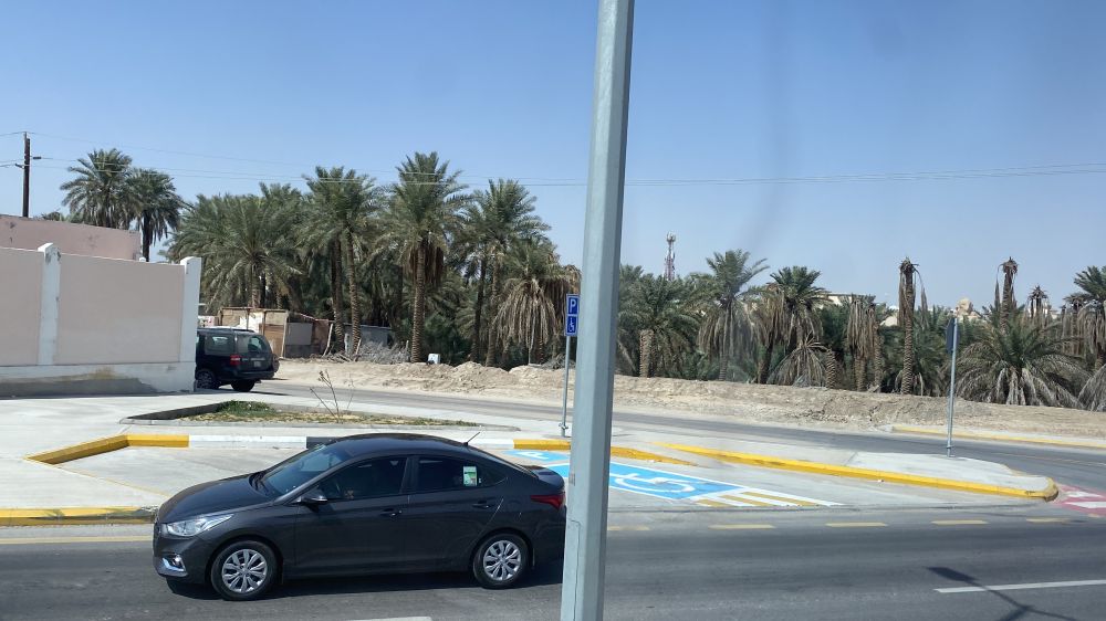 由于轮胎爆裂失去了不少时间,我们只能透过大巴的窗口,窥探千年沙漠文明。正值下午骄阳当头,店铺街道静悄悄的。路边的椰林厚厚密密见不到头。没有机会去参观老旧的清真寺,和霍富夫AL HOFUF这个古城中心。