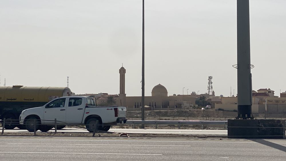 开在尘土飞扬的高速公路上,车速不会高过50M/Hr,路面欠缺平整,两边偶尔见到绿色荆棘,或是楼房建筑。巴裔导游告诉我们说,图片里建筑应该是建造中的清真寺。 路边沙包土堆下面可能就是石油管道或控制器啥的。开过的车标有Schlumberger斯伦贝谢公司,或是Halliburton哈里伯顿公司,巴导不屑一顾地告诉大家Saudi Aramco沙特阿美才本国最大的地头蛇,哈哈。驴友们跟巴导滔滔不绝聊天,大家也了解到,这些年来,中国在中东项目越来越多,一些建筑上标有中国字样的公司。做小生意的华人也多起来,贸易中国商品,不过三年疫情很多生意包括华人的都关了回国。