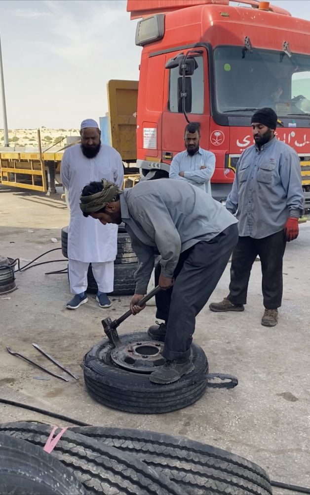 正聊着天,说着外来工人的收入约莫AED5000左右,也没有太多的福利,好在急诊治疗都免去费用了。此刻,听得车底下的刺耳声,猜想是爆胎啦。好在500米的前方有加油站,附带修车小店,下车来,一查看轮胎基本上没有了轮胎纹!