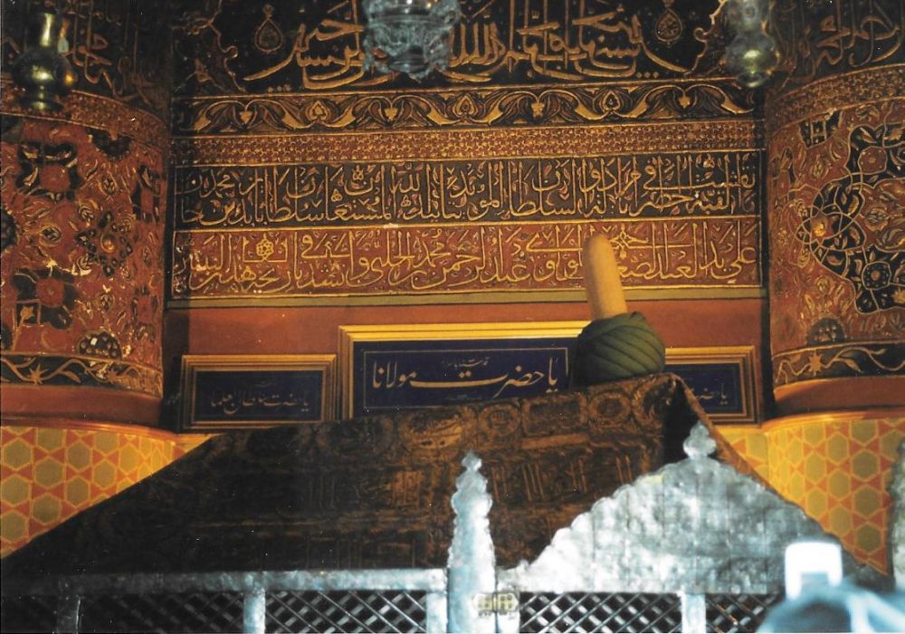 汽车直接开到蓝陵博物馆 - 儒密的陵墓所在地。我买好门票进馆。最引我注目的是一块门额,上面的文字(土耳其文?阿拉伯文?)庄重而又苍劲有力。我进入兰陵博物馆。我的第一个印象是,灯光之下室内显得金碧辉煌。中华文化中金黄色代表尊贵和显赫。金黄色和陵墓不相称。这种气氛和基督教文化也相差很远。教堂里总有一种昏暗的,一种烛光造成的虚无缥缈的气氛。四周的墙壁上挂满了彩色的挂毯,挂毯上有精美的文字,很可能是儒密的诗句,或者赞美他的诗句。儒密的灵柩上覆盖着毯子,供信徒们顶礼膜拜。来此朝拜的有土耳其人也有伊朗人。据说伊朗是儒密的故乡。为逃避成吉思汗的大军,他年幼时随同父亲来到科尼亚。他受到神秘的云游僧人的启发,创办了苏菲修炼者兄弟会,创造了在旋转过程中达到忘却自我,进入神心合一状态的祈祷仪式。
