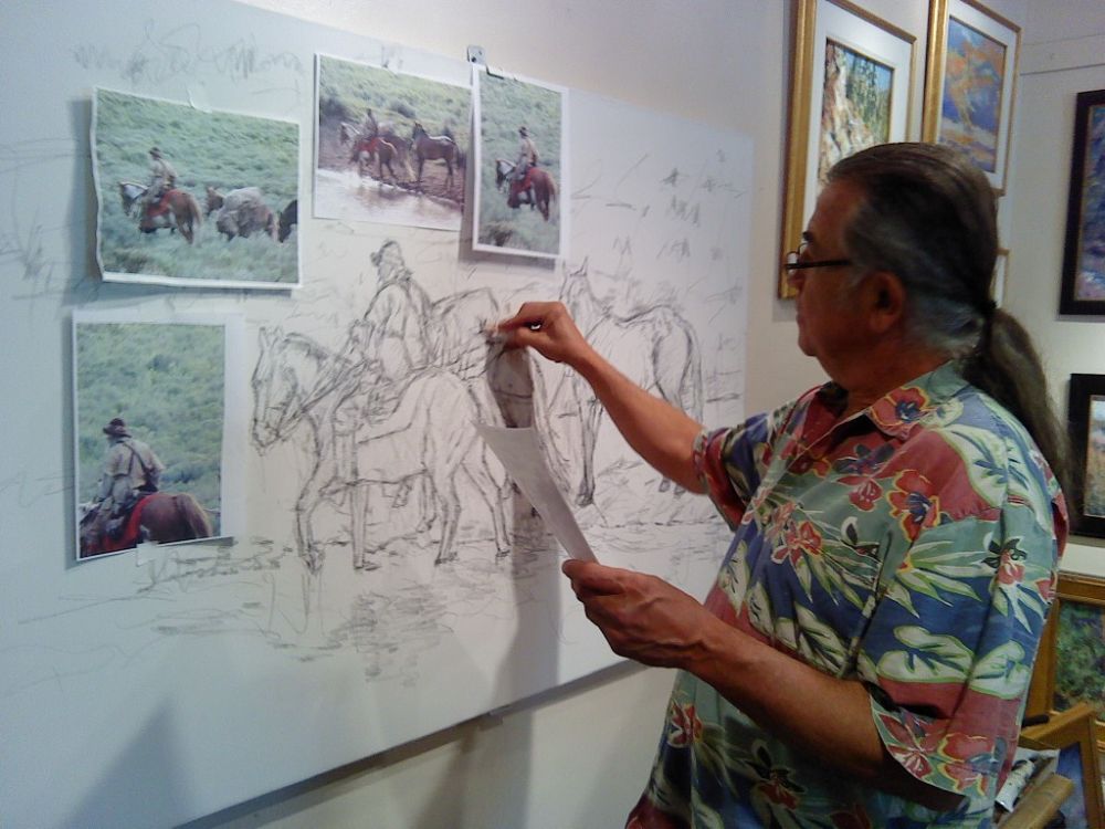 这幅画的题目是“Plaza of Santa Fe in the 1800s”,画上部左边的那排房子应该是“总督宫殿”,当时已经200多年了, 1992年画这幅画时,都快400年了,画家就有这本事,要么非要有模特不可,要么眼前有的可以视而不见,可以想象,