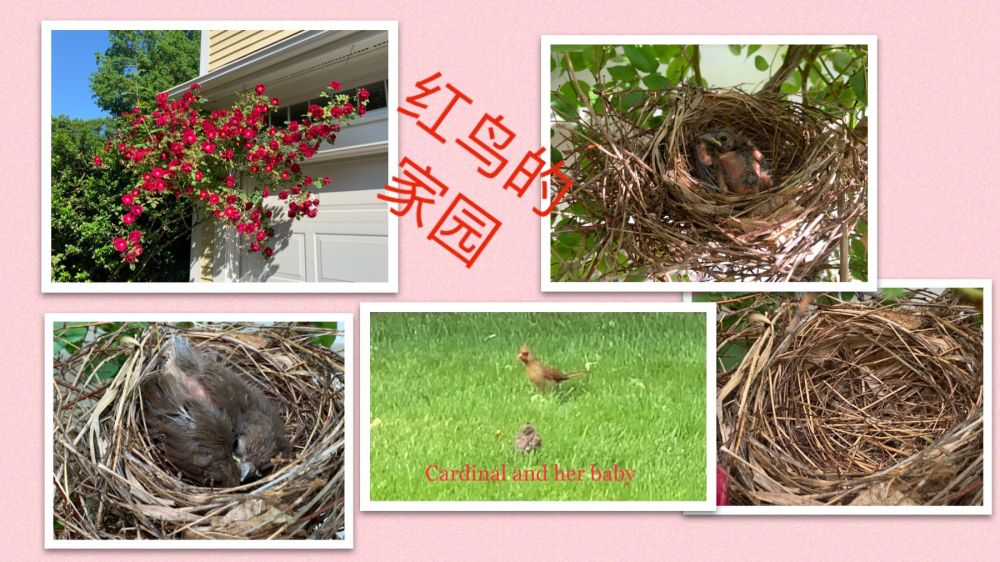 在发现了鸟巢和巢里的知更鸟蛋几天后,五月底(5.30)又欣喜地发现了另一个鸟巢,坐落在前院东侧车库与花台边的爬墙月季花丛里。