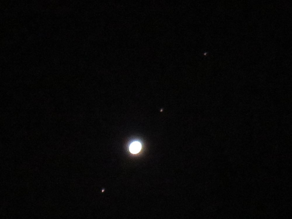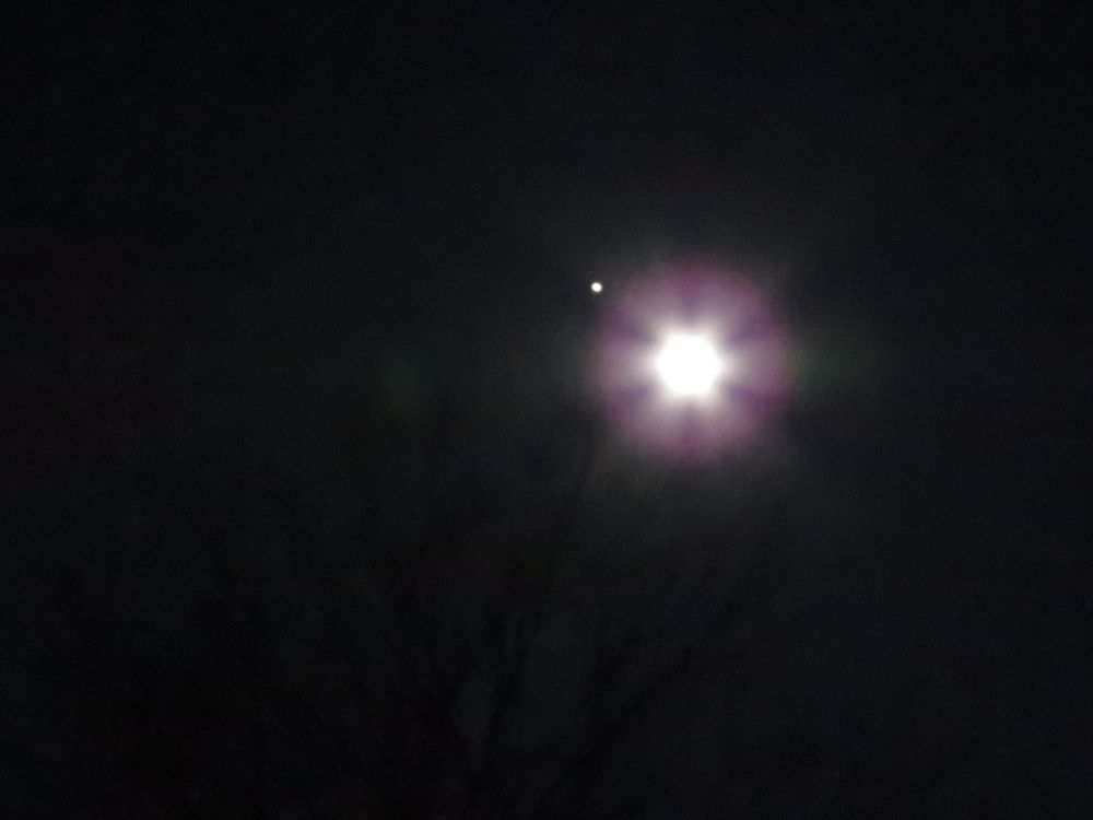 今夜“星”空灿烂,树梢托云,木星伴月,月亮更似一颗“新星”,而木星有点象“满月”。木星 (Jupiter) 的 3个月亮也是依稀可见, 小卫星们承欢膝下不离不停的绕着他们的太阳,一个难得一见的太阳系里的“小太阳系”。 昨晚和今天的木星是今年距离地球最近的,所以这般的明亮这般的慷慨,让我们一饱眼福木星一家的美妙美满。今晚天上最亮的“星”(planet) 就是这颗可以目视的木星。我知道在以往的年月里肯定也曾见过他,但是不相识所以不相知。但是今夜我在月下等他会他,第一眼看到他就知道我们曾经眼神交汇过。我想对他说,在最好的时光遇到了最好的你,今晚你就是我的太阳。