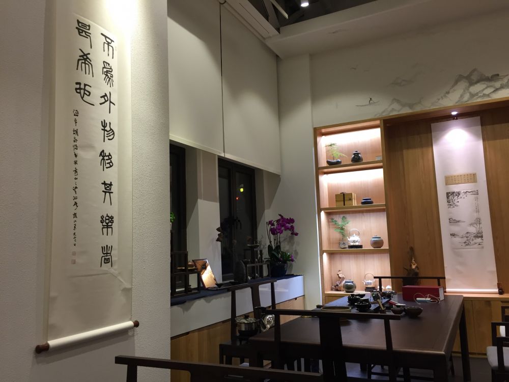 我要去的茶室, “宽庐”, 就在三楼,专供五夷山的“大红袍”。五夷大红袍早已如雷灌耳,何况 “宽庐” 经营的就是那正经八百的大红袍,更何况 “宽庐” 的少老板特别邀请我去体验这座新开在外滩上的茶室。今晚,我是抱着一睹芳容的猎艳之想赴“茶”来的。朋友是茶室的“创二代”,也即这位少老板,己在另一遍愽客有专门介绍。当时他人虽远在闽北,在我到达之前,已经给店里的服务人员打了招呼我的到来。所以,我一进茶室,茶艺师小戴就热情的迎上来,带我楼下楼上参观了一番,介绍茶室的规模和经营的茶品种。参观完毕,她带我到坐位,开始品功夫茶程序。在她准备器皿时,我扫描了一下环境。茶室一楼布置的很仆素,一面墙安放的是一排敞开的原木柜架,各层的架子上摆放着不同尺寸和颜色的茶叶包装盒,一些小摆件或工艺品夹在其中,其它墙壁上挂着淡墨的中国字画。室内有2-3张大桌,各配2-3张扶手靠椅,一袭“宋朝”的简约。窗台上几盆兰花,在浦江的夜景下摇曳多姿。一对情侣在另一张桌上慢品轻啜杯中汤,偶尔相对细语。两位茶艺师轻衫轻步,静若子兰。这里好安静,好一个 “大隐隐于市” 的武夷茶人。