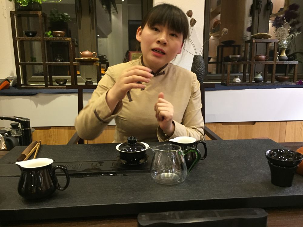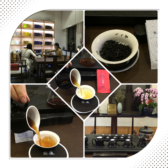 小戴束着一条粗粗的辫子,浅笑倩兮,温文尔雅。她拿出一袋“肉桂” 岩茶,用规范的动作洗茶、温杯、泡茶、注杯、敬茶。她一边司茶一边给我讲茶的品质:岩茶是70%的发酵茶,其代表有肉桂、水仙、大红袍;纯种大红袍有奇丹,北斗,雀舌。我们各执一杯,她开始陪我品茶:第一泡茶冲水的时间要短些以减少茶碱的涩味;第一泡茶包含了很全的茶元素,所以茶滋味浓郁芳香。我们一边喝一边聊着,时间也好象冻住了,流的很慢。喝了5-6泡以后,她又让我挑一种未尝过的品质茶来试试。我早就偷偷瞄过桌上的价格单,现在喝的肉桂单泡价是100 或每斤2000,“天价”大红袍单泡是220或每斤6800,而最顶级的“金油滴" 单泡是1800或每斤68800!我暗暗的估摸着喝“金油滴“肯定有些肉痛,喝“天份” 还能承受也不至于太跌份。好,喝“天份”吧。戴小姐又心定神闲的重复着那些规范和礼仪,我也细细品味着大红泡滋味 。这款茶只泡了3-4次,我就叫停了,喝了近2个小时,已经喝不动了,更主要的是时候不早了。当我要付钱时,小戴笑拒了,说这是 “老板请你喝的茶”。 哎呦喂,太惊喜了。早知如此,我就一点也不纠结,点 “金油滴“了 (亊后侃姐)。因为已经夜深,十一点了,为安全起见,戴小姐开车直接送回外滩的另一头,外白渡桥边的旅馆。今晚还真是 “赚的盆满钵满的”:不但“白”渡桥了,“白”坐车了,还“白”喝茶了,妙哉。