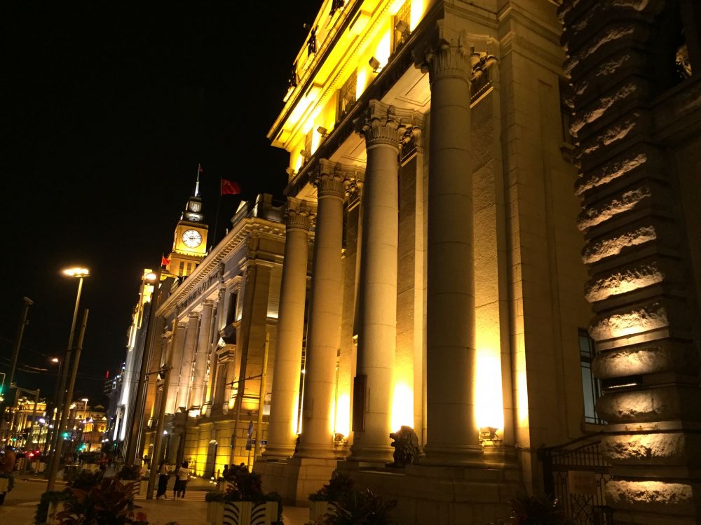 吃完饭,我们就出了临江的旅馆,经过黄浦饭店,过外白渡桥,来到外滩公园。我们走走看看。此时,江对面的高楼群形成了一个壮观的夜晚天际线,东方明珠以其独特的风格鹤立群楼,江水映岸呈红的绿的波纹,游轮如织穿梭在浦江之上,好不热闹。趁此机会我又拍摄了一些浦东夜景的照片。然后我们穿过中山东路来到外滩的不夜街,“万国建筑博览群” 的人行道上,看华灯熣灿,看人来人往。不久,同学要赶回莘庄家中,我送她去北京路口离去后,我的下一个活动就是去喝茶。