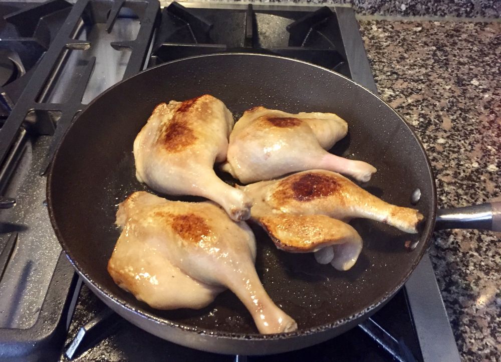 3. 在平底锅稍煎鸭腿,煎至两面微黄,停火。